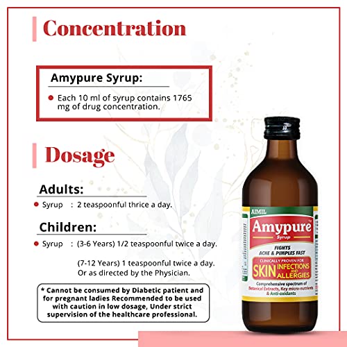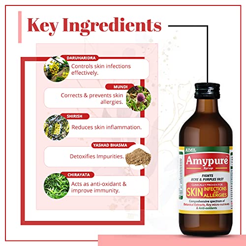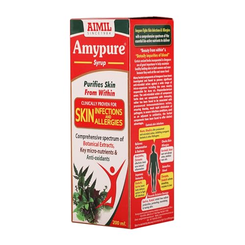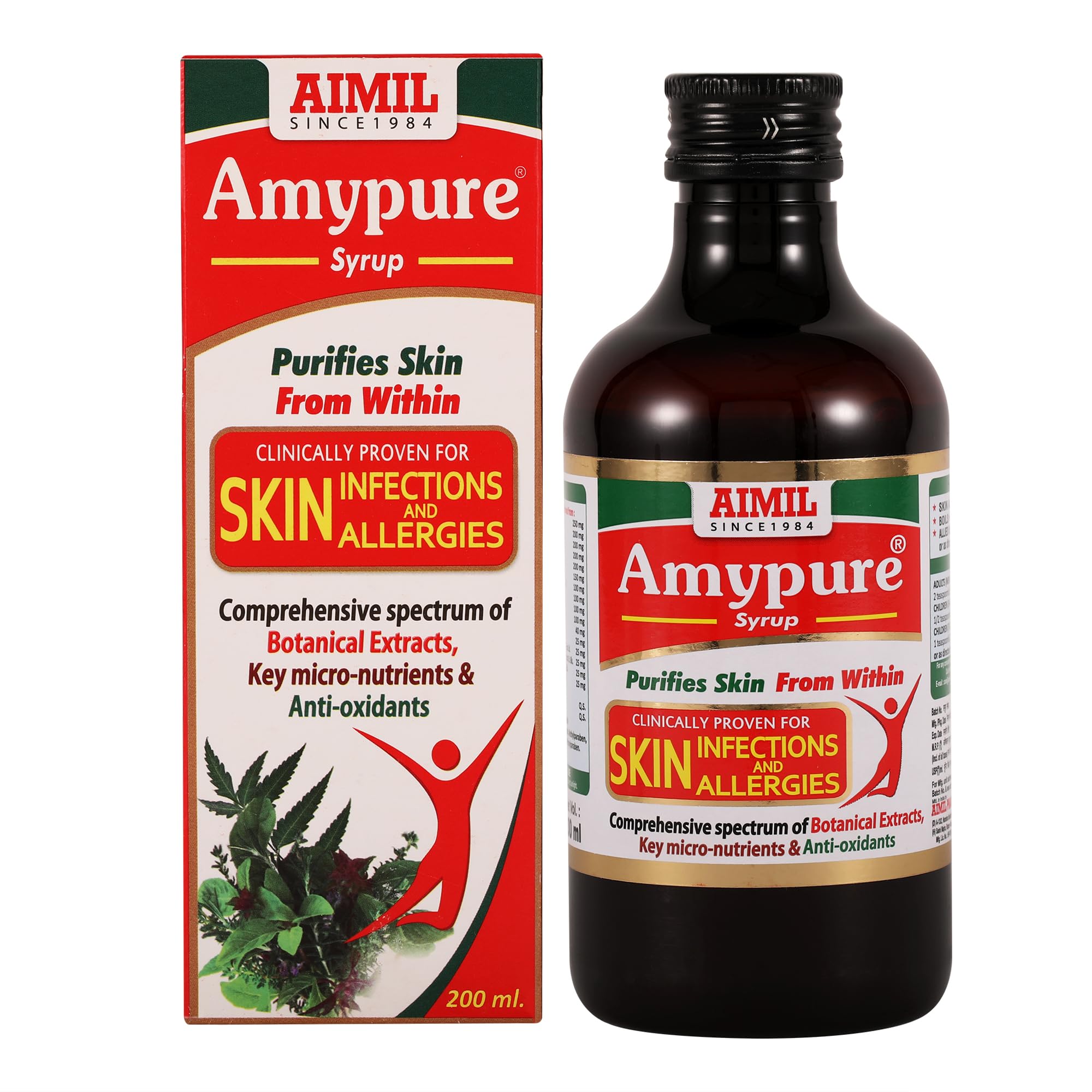 Amypure is a unique formula for inner health & outer glow acts by detoxifying impurities of blood. Aimil Amypure Syrup is an ayurvedic medicine that is primarily used for the treatment of Skin Infections Skin Allergy Pimples Burning sensation on skin. Amypure Syrup works effectively against chronic skin infections.