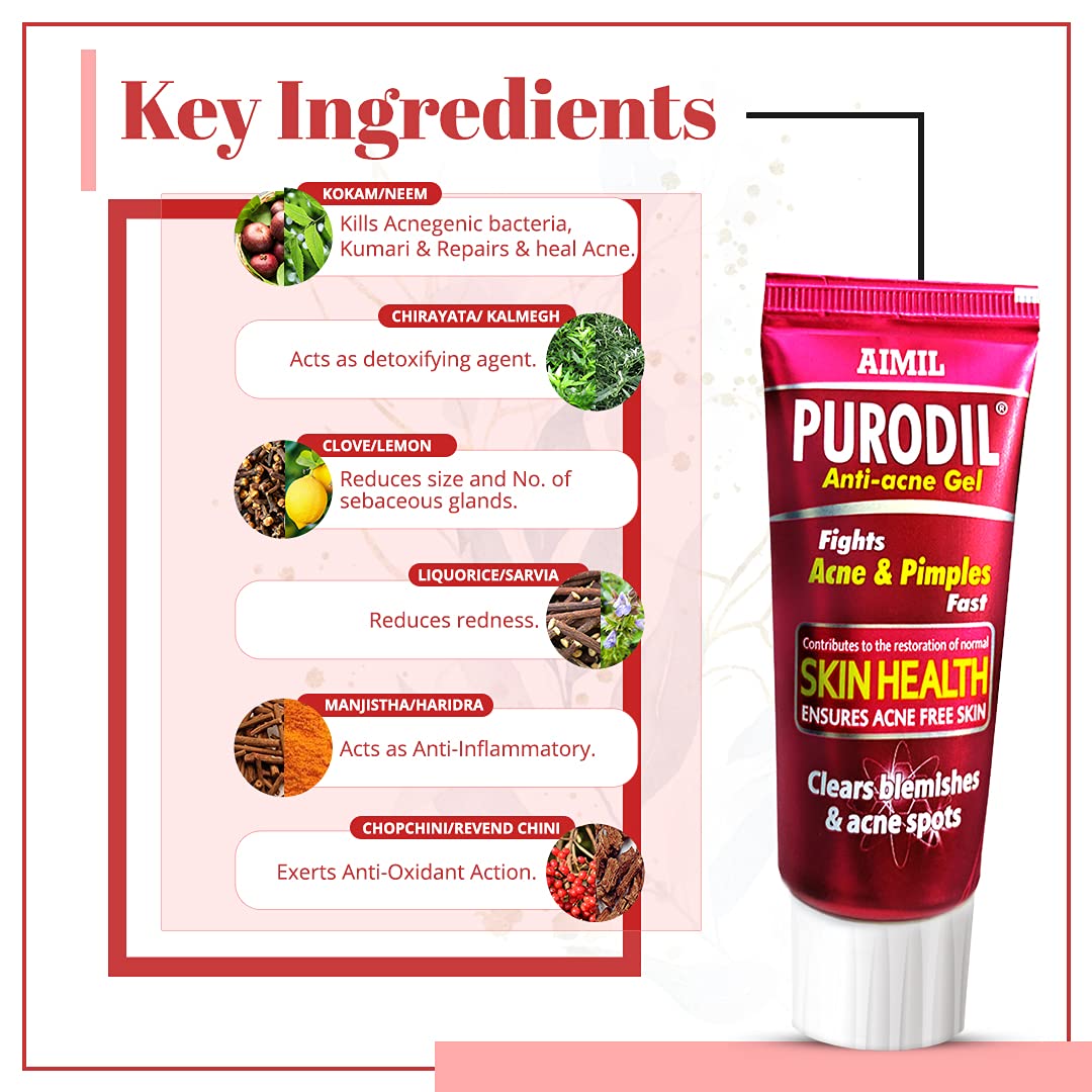 Purodil Anti acne gel a unique blend of natural ingredients contains a novel molecule mangostin derived from garcinia extracts of alovera neem lemon peel and many to fight acne and pimples.