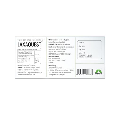 Direction of Use & Dosage: Take one tablet of LaxaQuest with lukewarm water before going to bed. The recommended dosage is one tablet at night.