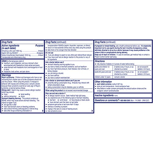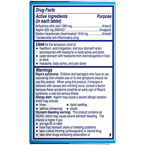 Alka Seltzer Original Heartburn Relief and Pain Relief Antacid Tablets bring fast relief of heartburn upset stomach and acid indigestion. Providing trusted and effective relief for more than 80 years Alka Seltzer Original tablets contain anhydrous citric acid and sodium bicarbonate that neutralize acid fast on contact relieving acid indigestion. These Alka Seltzer tablets dissolve in water quickly delivering fast relief that you can hear see and feel working.