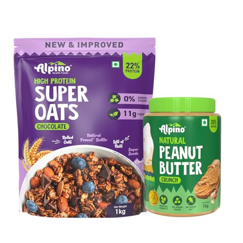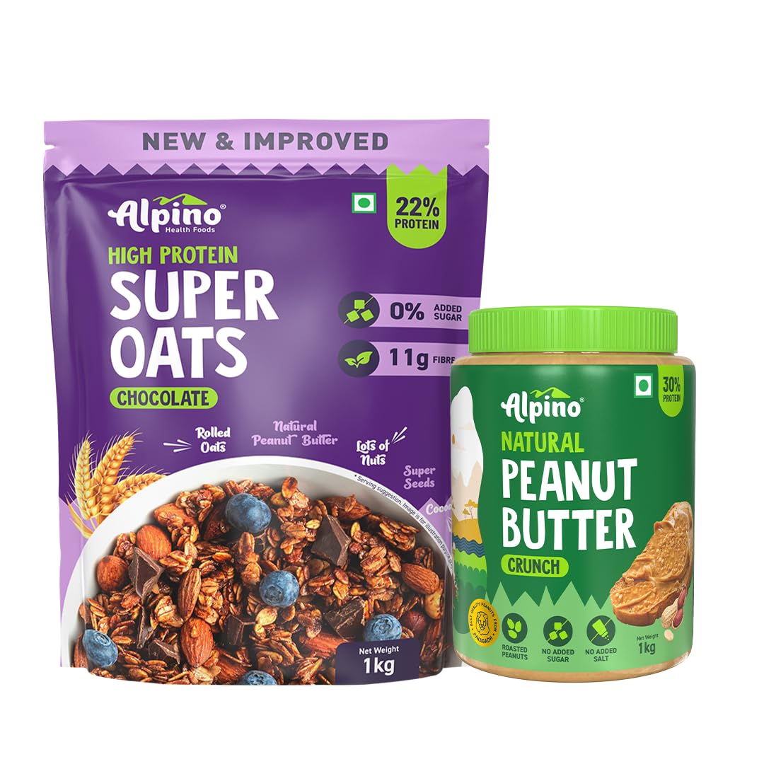 Alpino Pre-Workout High Protein & Fiber Diet Super Combo - High Protein Super Oats Chocolate 1kg, Natural Peanut Butter Crunch 1kg