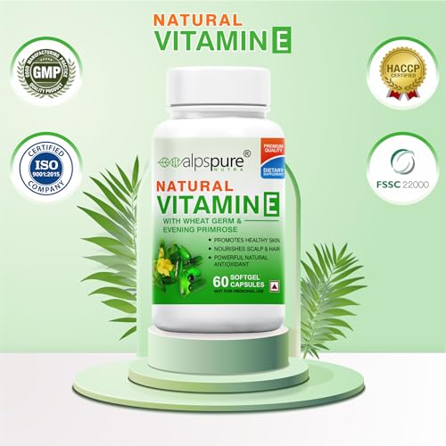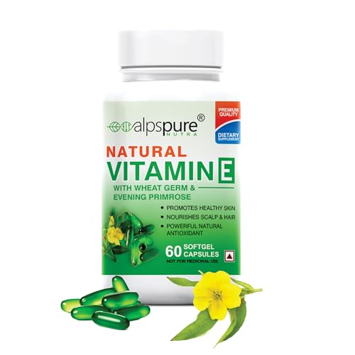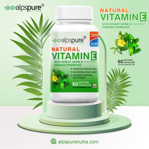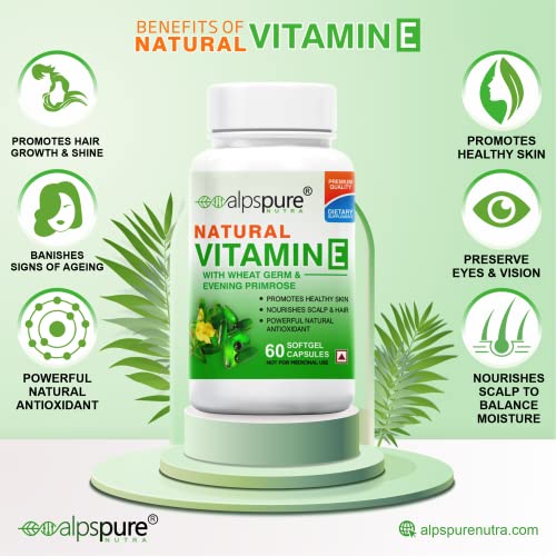 Alpspure Nutra Natural Vitamin E Softgel Capsules Natural Source for Skin, Hairs & Body care with Wheat germ oil, Immunity Booster, Controls Wrinkling & Skin Roughness Pack of-1