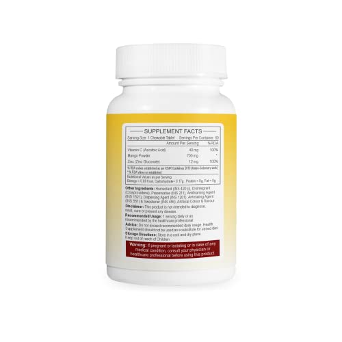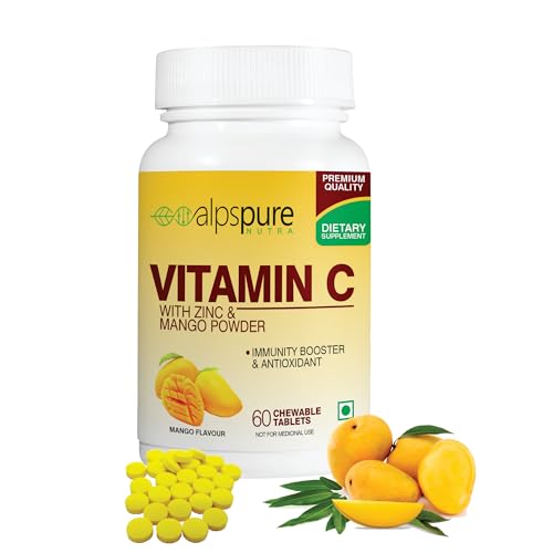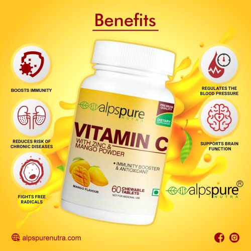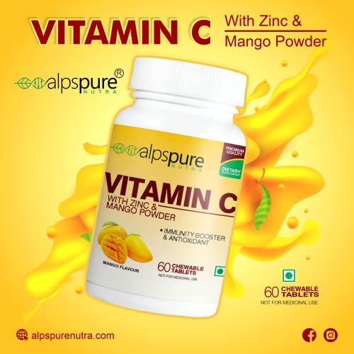 Alpspure Nutra Vitamin C Mango With Zinc Chewable Tablets, Immunity Booster & Antioxidant | Promotes Healthy & Glowing Skin | (Mango, 60 Chewable Tablets)