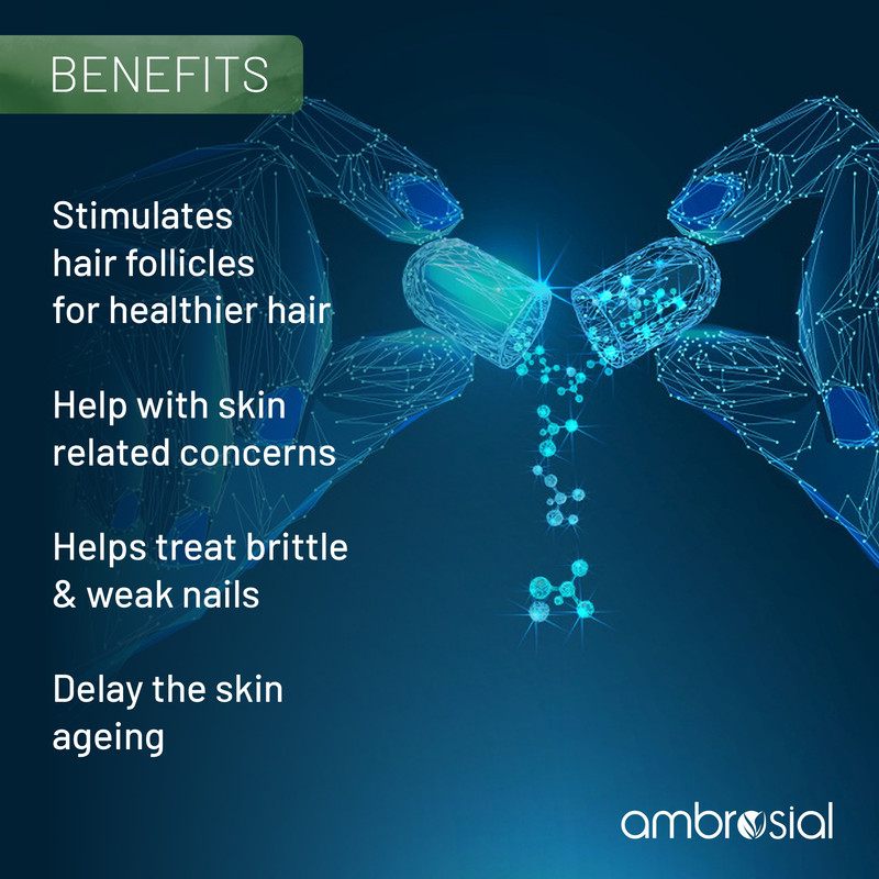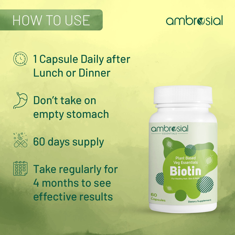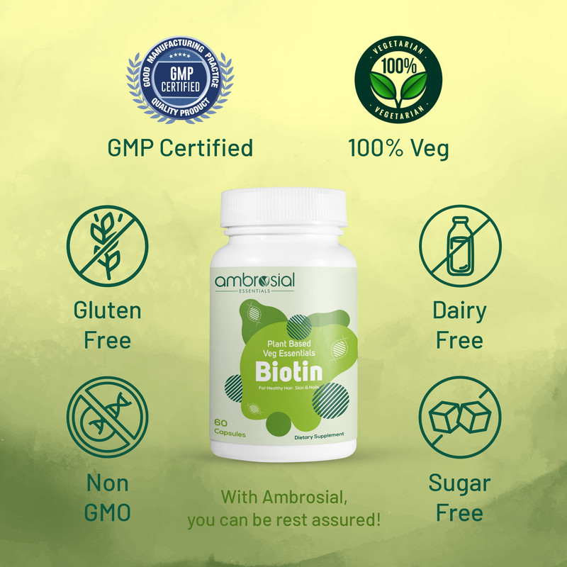 • Ambrosial Plant based Biotin capsules promotes hair growth and stimulates hair follicles for healthy & strong hair.