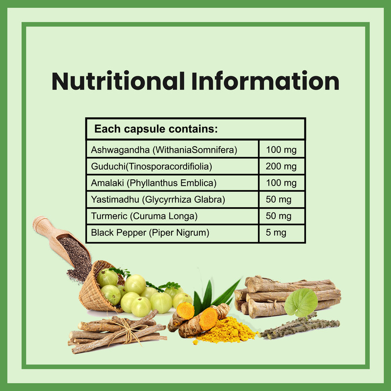 It is the perfect blend of 6 i.e Ashwagandha, Guduchi (Tinospora Cordifolia), Amalaki, Yashtimadhu, Turmeric & Black pepper natural herbs.Ashwagandha may help in lowering the level of triglycerides in the blood resulting in a reduced cholesterol level.