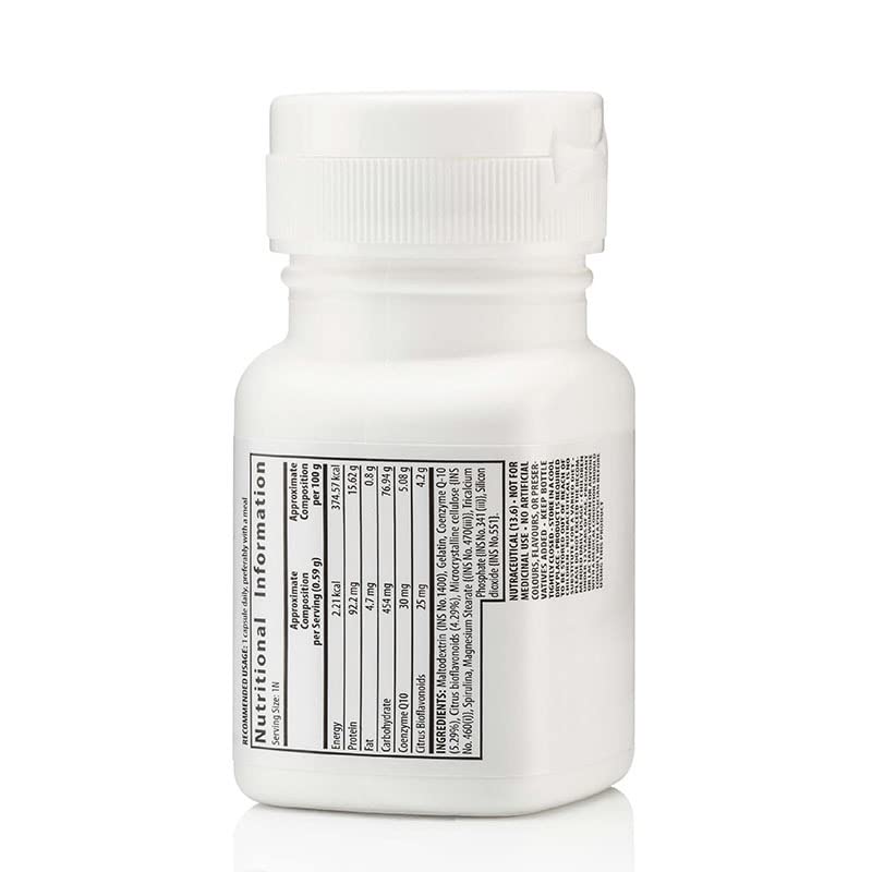 Nutrilite coenzyme q10 an excellent source of coenzyme q10 that supports the energy production in cell and is also a potent antioxidant. Supports healthy heart and every other cell in the body an excellent source of coenzyme q also contains exclusive nutrilites citrus bioflavonoids per serving provides 30 mg of coenzyme q10 which enables cells to produce energy they need to perform optimally. It is a potent antioxidant and neutralizes free radical damage per serving contains 25 mg of citrus bioflavonoids for additional benefits of phytonutrients benefit nutrilite coenzyme q10 is an excellent source of coenzyme q10 that supports the energy production in cell and maintains the energy levels in the cell. Several clinical studies with coenzyme q10 have demonstrated positive effects by enhancing heart health. Getting sufficient coq10 ensures that your heart muscles cells will pump efficiently and give you a healthy heart. It is a potent antioxidant and neutralizes free radical damage supporting a strong heart begins with promoting strong heart cells. Take nutrilite coenzyme q10 every day along with balanced diet and healthy lifestyle to support healthy heart and every other cell in your body use instruction one capsule daily preferably with meal 45 capsules.