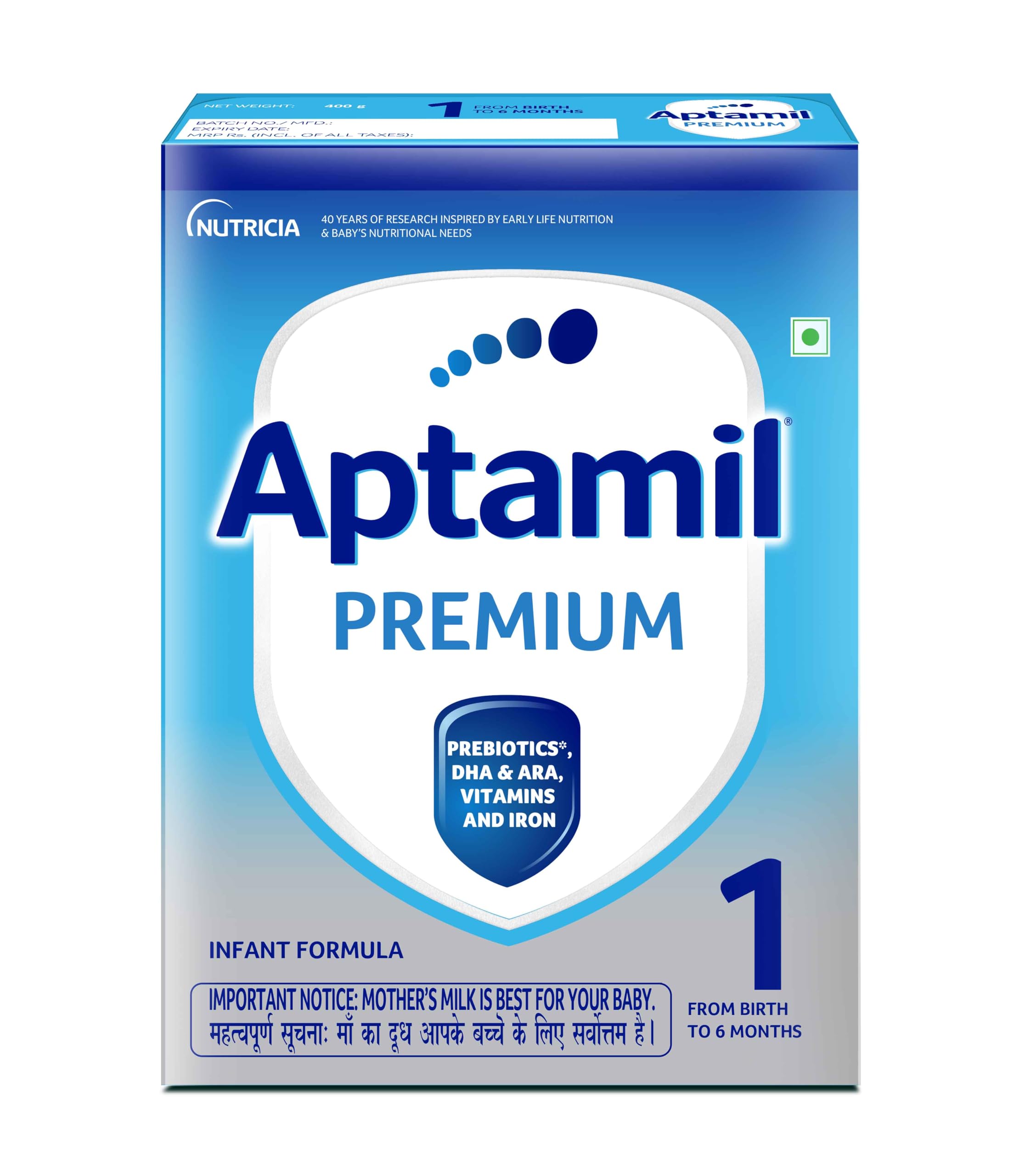 Aptamil Premium Infant Formula Milk Powder for Babies - Stage 1 (Upto 6 Months) - with Prebiotics and DHA - 400gms - BIB Pack