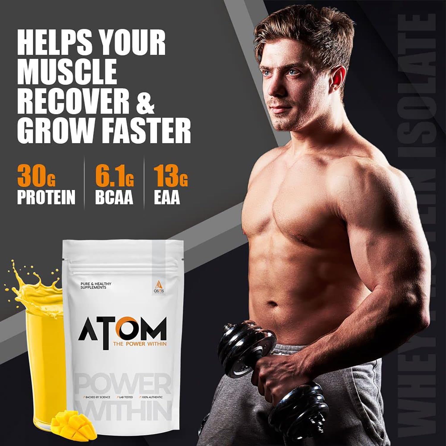AS-IT-IS ATOM Whey Protein Isolate 1kg | 30g protein 6.1g BCAA & 13g EAA | Ultra Pure-Fast Acting Protein |Mango Delight Flavor