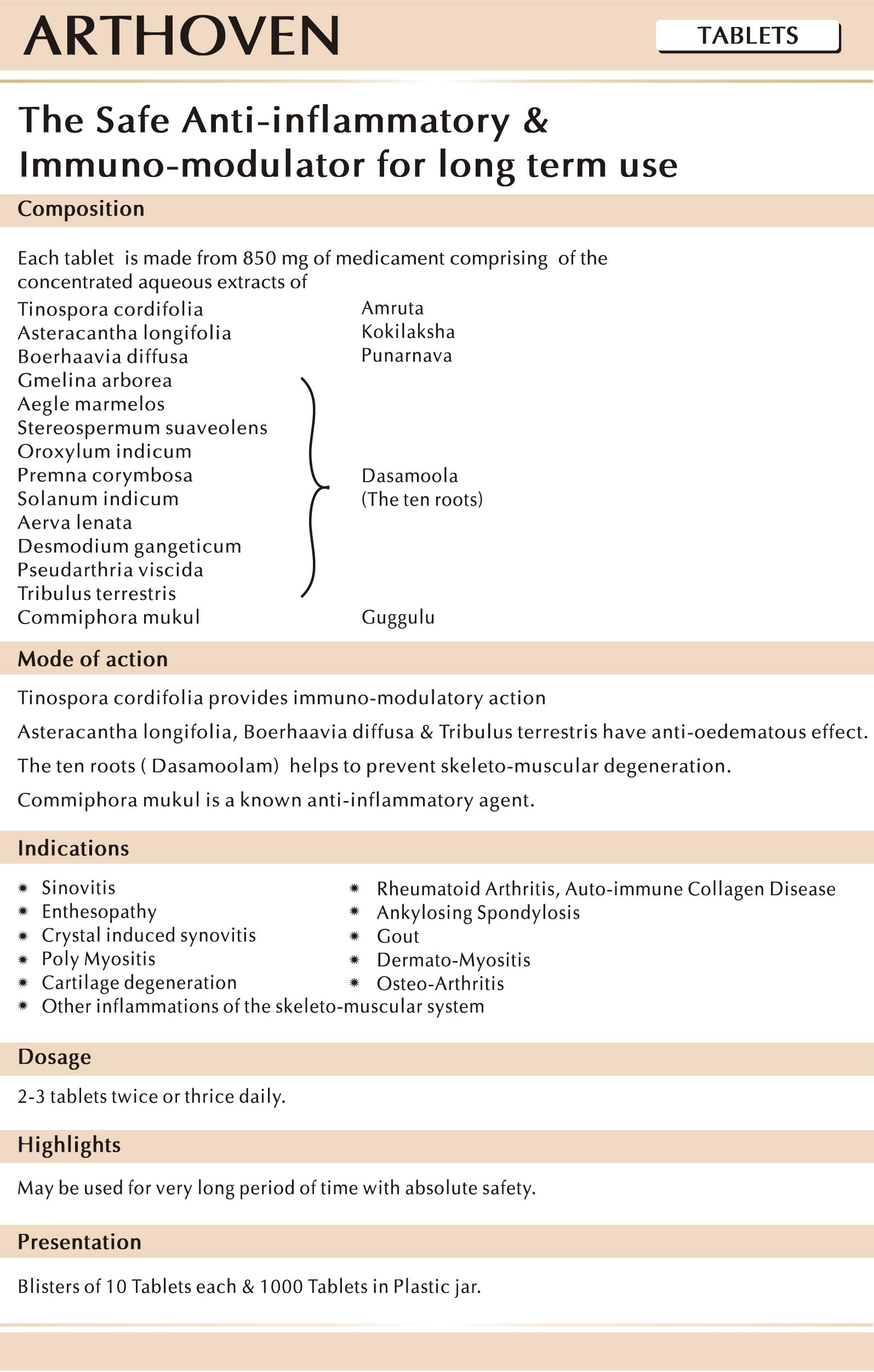 Dosage: 2-3 Tablets twice or thrice daily; Highlights: May be used for a very long period of time with safety