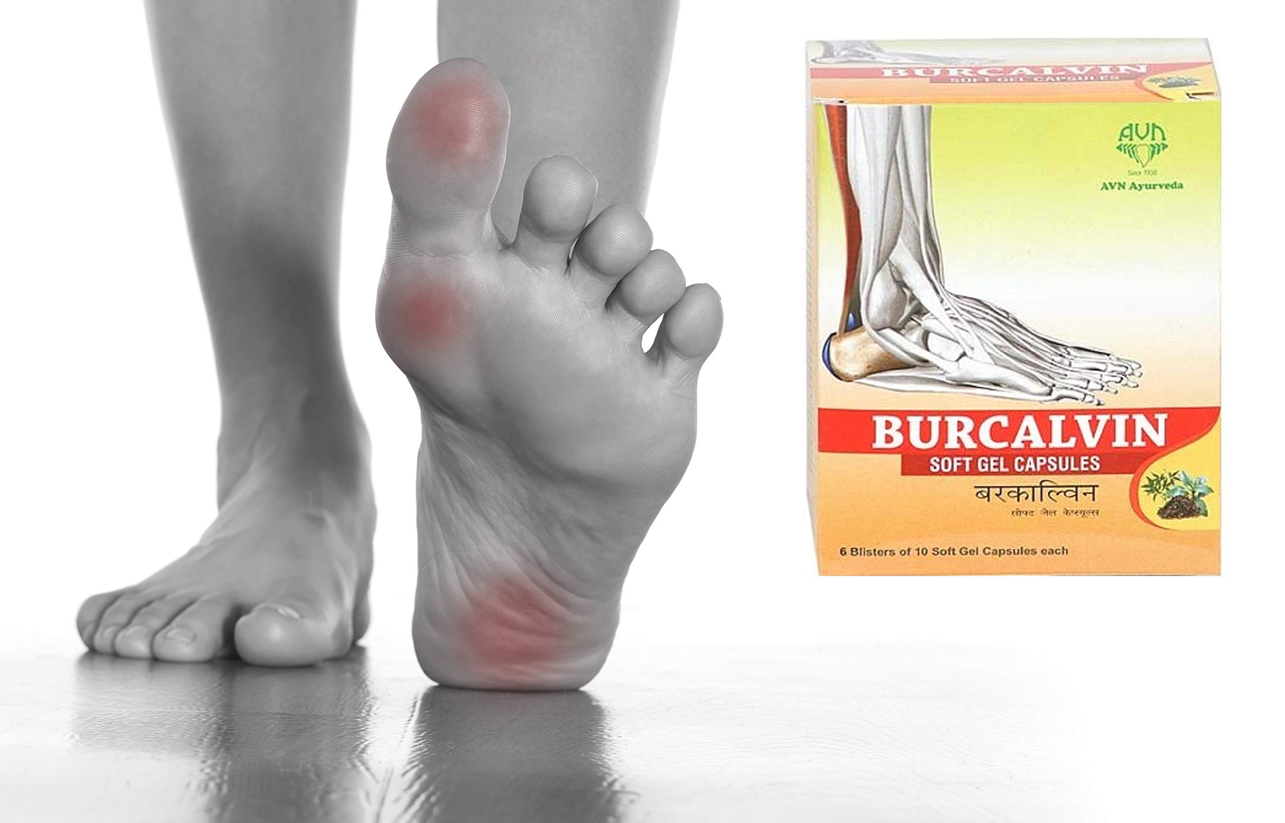 AVN Burcalvin Soft Gel Capsules. Indications: Major symptoms consist of pain in the region surrounding the spur which typically increases in intensity after prolonged periods of rest. A person may report heel pain to be more severe when waking up in the morning. A person may not be able to bear weight on the afflicted heel comfortably. Running walking or lifting heavy weight may exacerbate the issue.