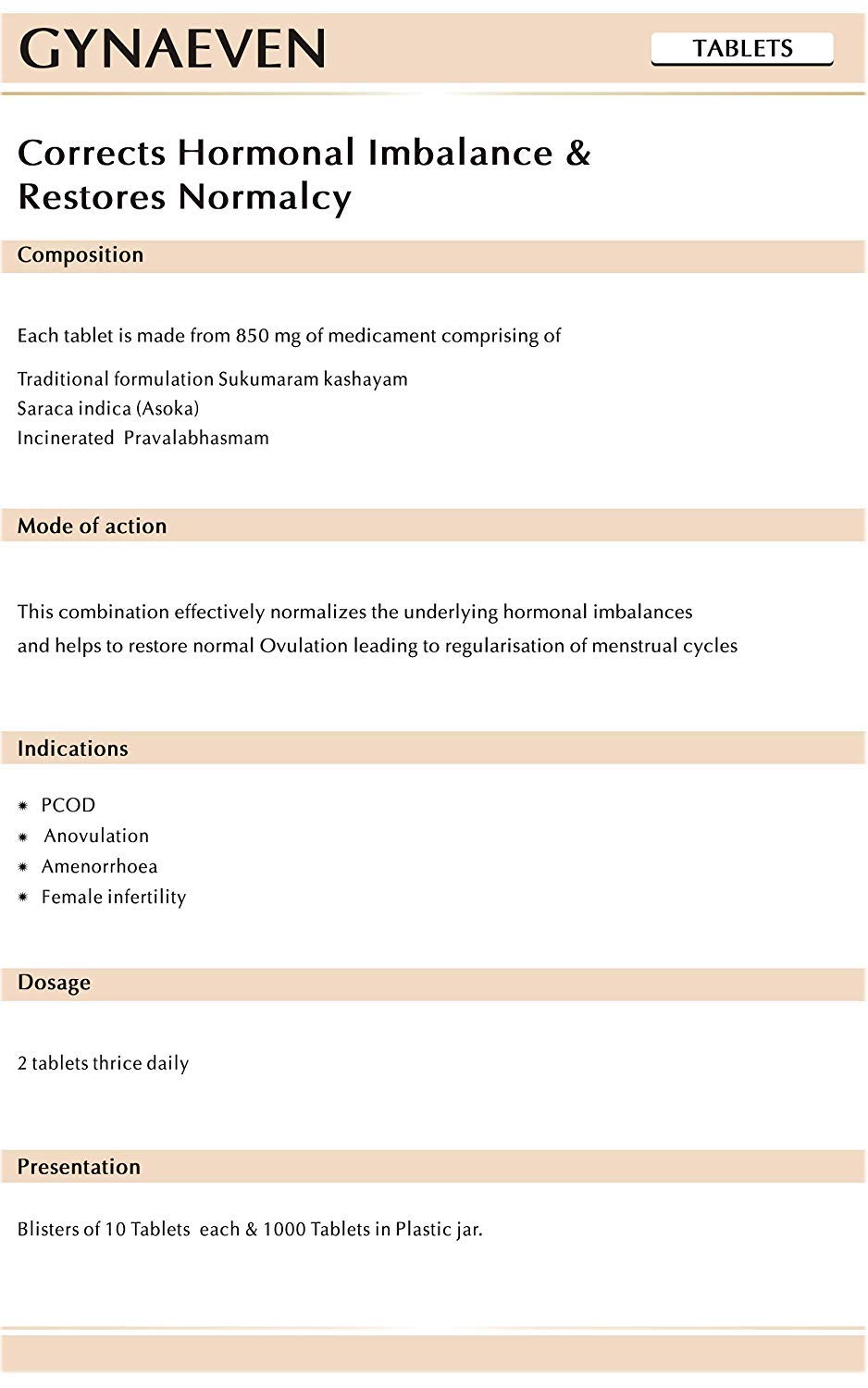 AVN Gynaeven Tablets. This product is processed using quality natural herbs and modern processing techniques. Dosage: 2 Tablets thrice daily.