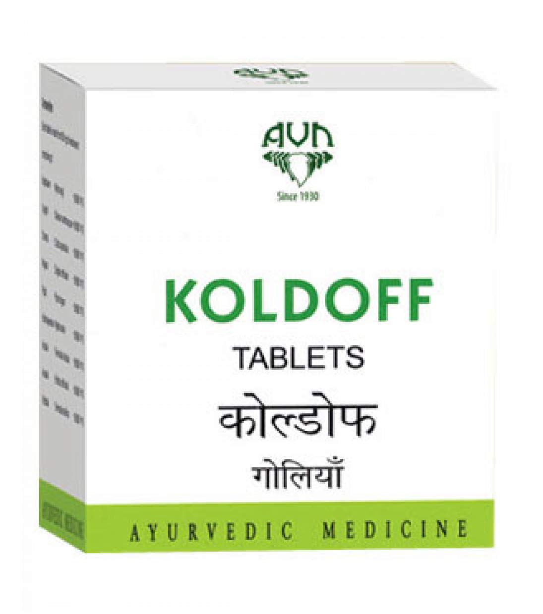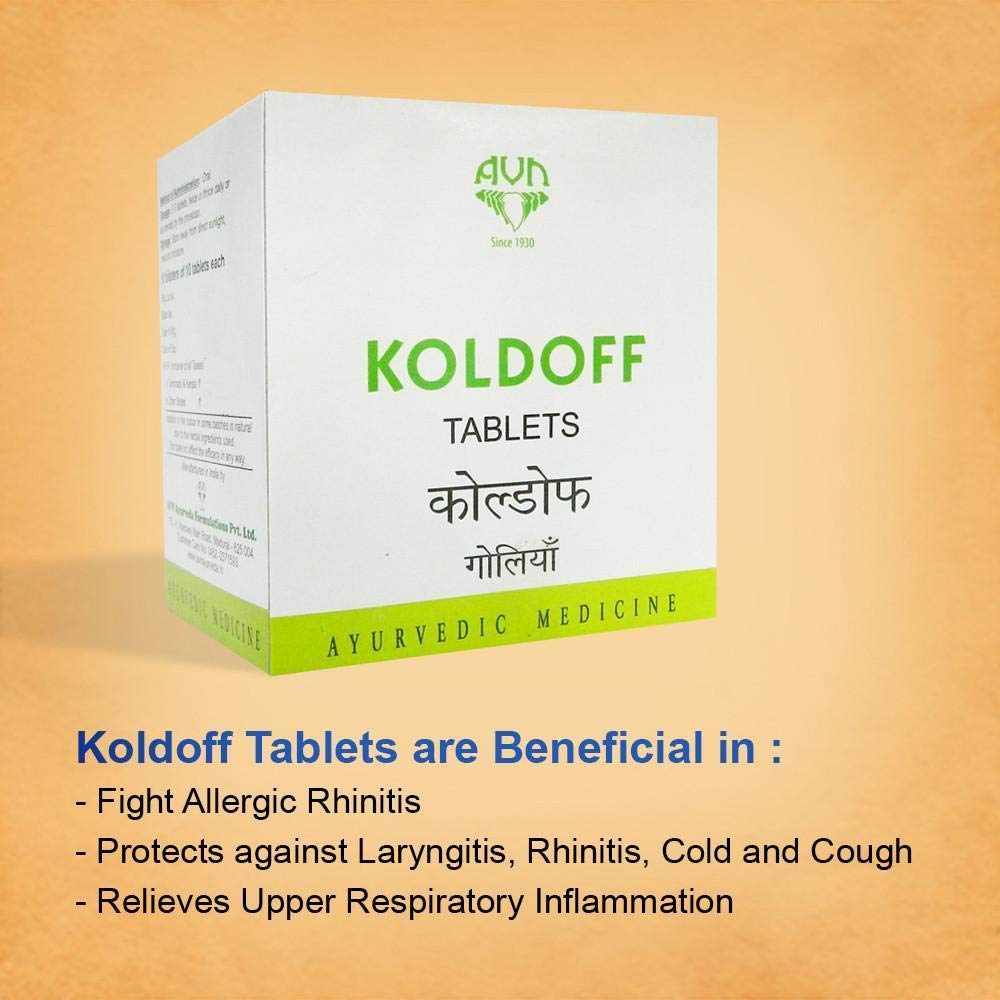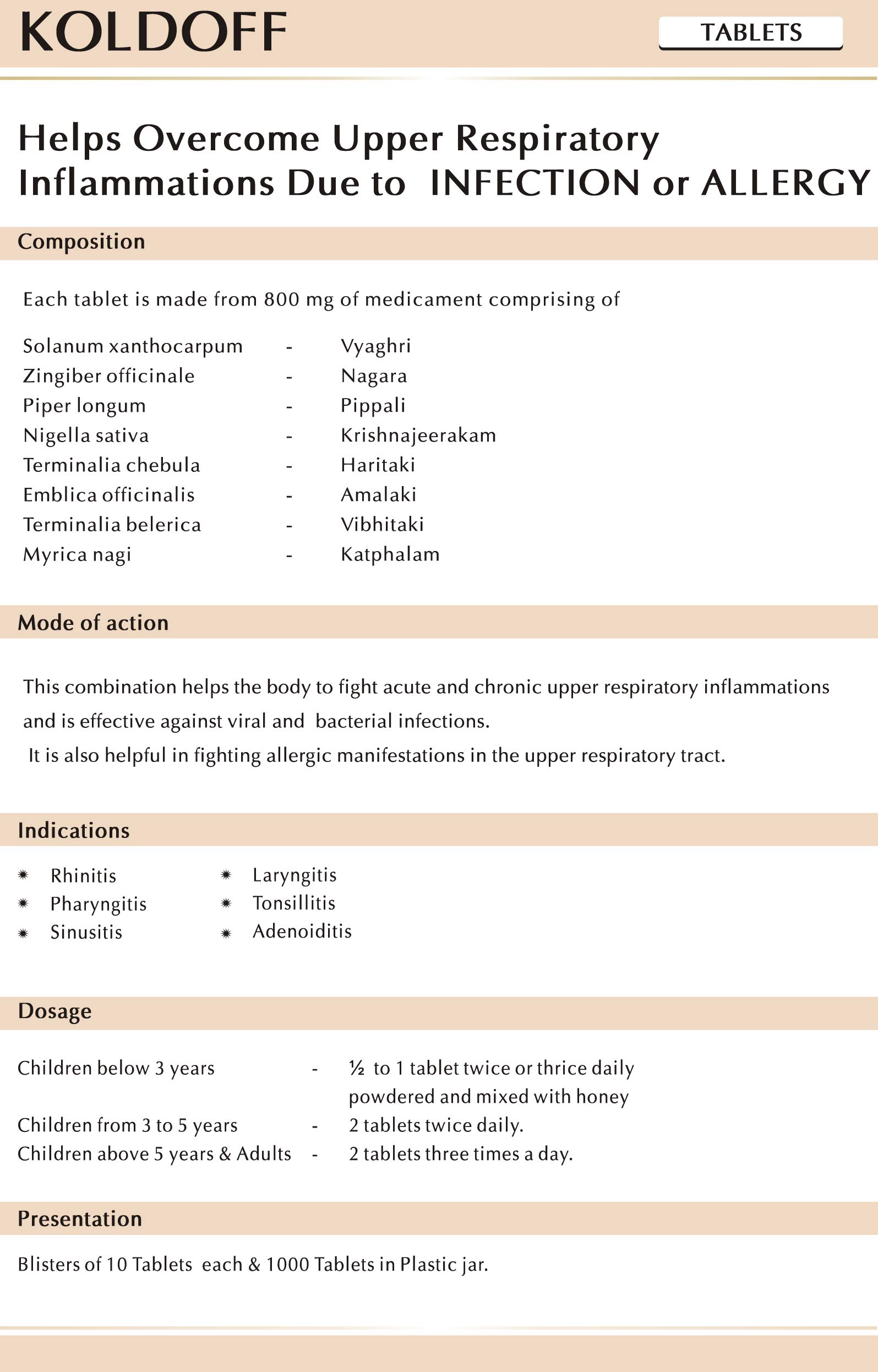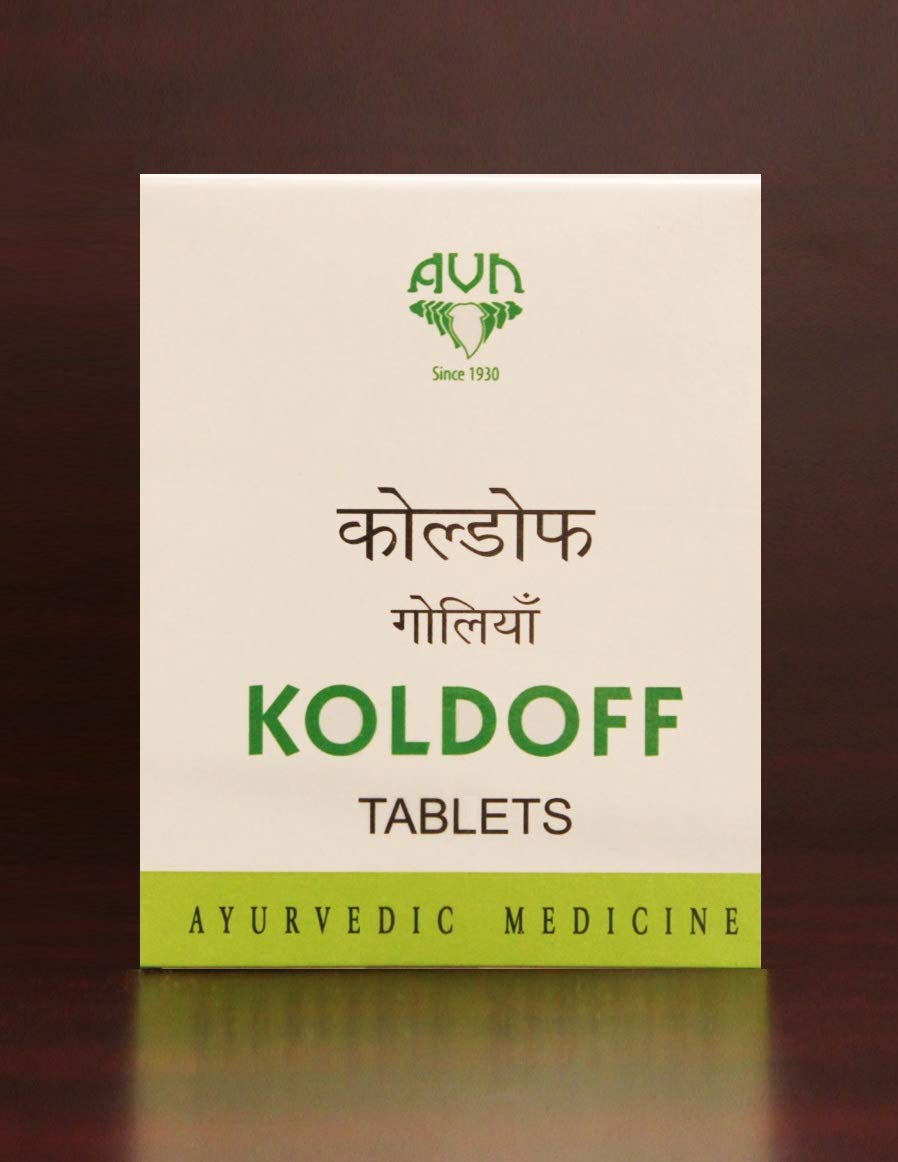 AVN Koldoff Tablets. Ingredients: Solanum Xanthocarpum (Vyaghri) Zingiber Officinale (Nagara) Piper longum (Pippali) Nigella Sativa (Krishnajeerakam) Terminalia Chebula (Haritaki) Emblica Officinalis (Amalaki) Terminalia Belerica (Vibhitaki) Myrica Nagi (Katphalam). Dosage: » Children below 3 years - 1/2 to 1 tablet twice or thrice daily powdered and mixed with honey; » Children from 3 to 5 years - 2 tablets twice daily; » Children above 5 years & Adults - 2 tablets three times a day.