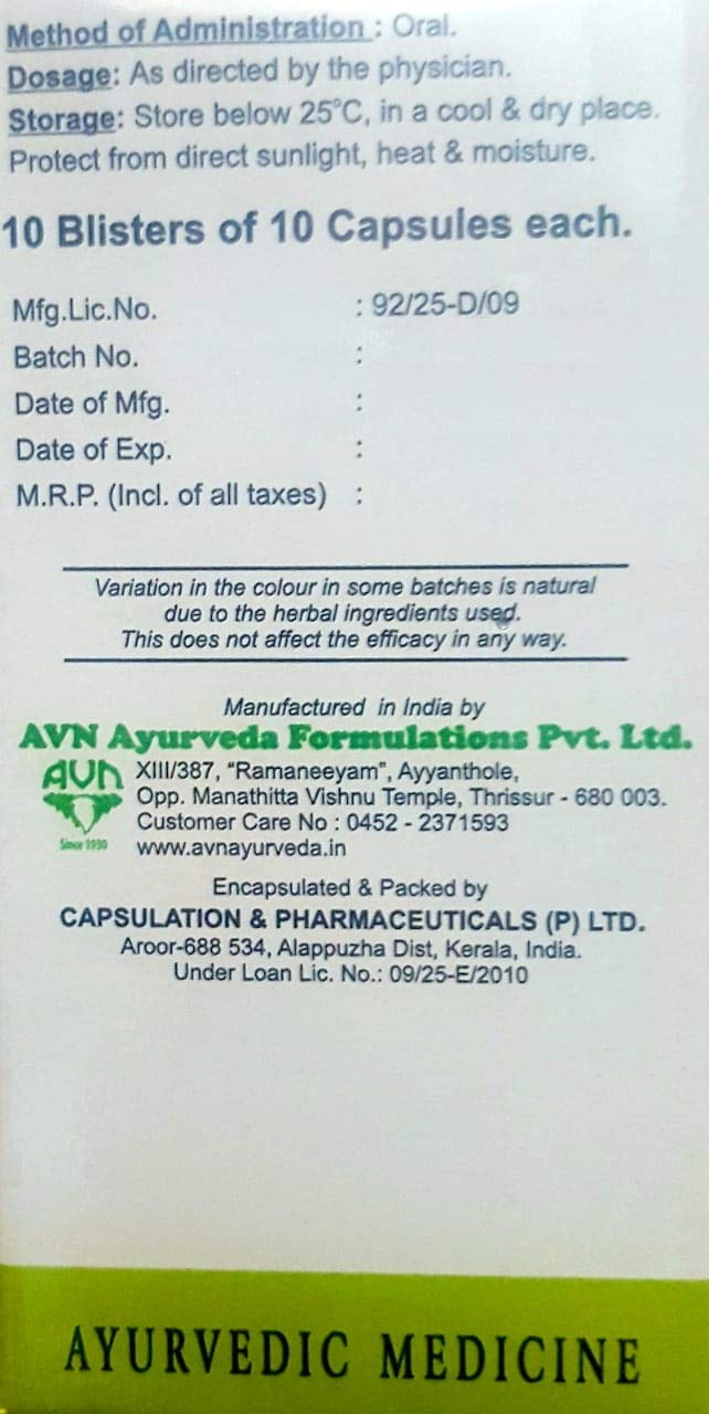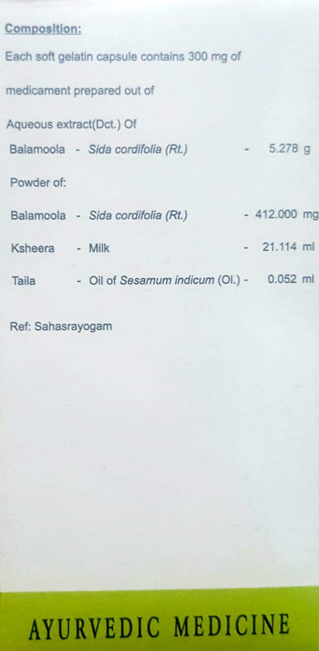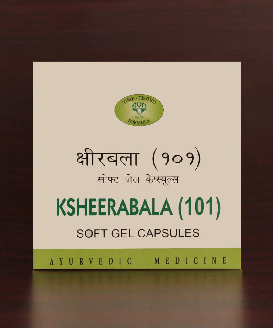 AVN Ksheerabala (101) Soft Gel Capsules Its properties are emollient cooling strengthening anti-rheumatic nervine and analgesic. Traditionally used for arthritis numbness injuries insomnia and nervous disorders. Ksheerabala Capsules is a Nervine Tonic which can be used in many neurological disorders as well as in rheumatism and insomnia.