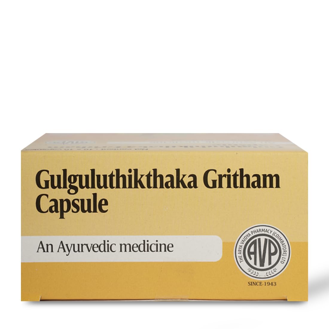 Rheumatic disorders encompass a group of chronic conditions that primarily affect the joints muscles ligaments and other connective tissues within the body. Effective management using authentic Ayurveda formulations is crucial to alleviate the burden of rheumatic disorders and empower individuals to regain control over their Physical well-being. AVP Gulguluthikthakam Gritham Capsule is the modified form of traditional ghee recipe in an easy to carry and consume format. The perfect blend of various herbs including purified Guggulu Chitraka Ballathaka etc. offer optimum support in managing conditions associated with Rheumatic disorders. It also effectively helps in alleviating pain stiffness and discomfort related to degenerative disorders such as Osteoarthritis. The Gritham Capsule is specially formulated to encourage skin vitality and assists in relieving inflammatory conditions related to skin and digestive system. A potent composition AVP Gulguluthikthakam Gritham Capsule undergoes 7-time fortification process enhancing its effectiveness and promotes healing of skin lesions Fistula and is beneficial in Chronic sinusitis as well.