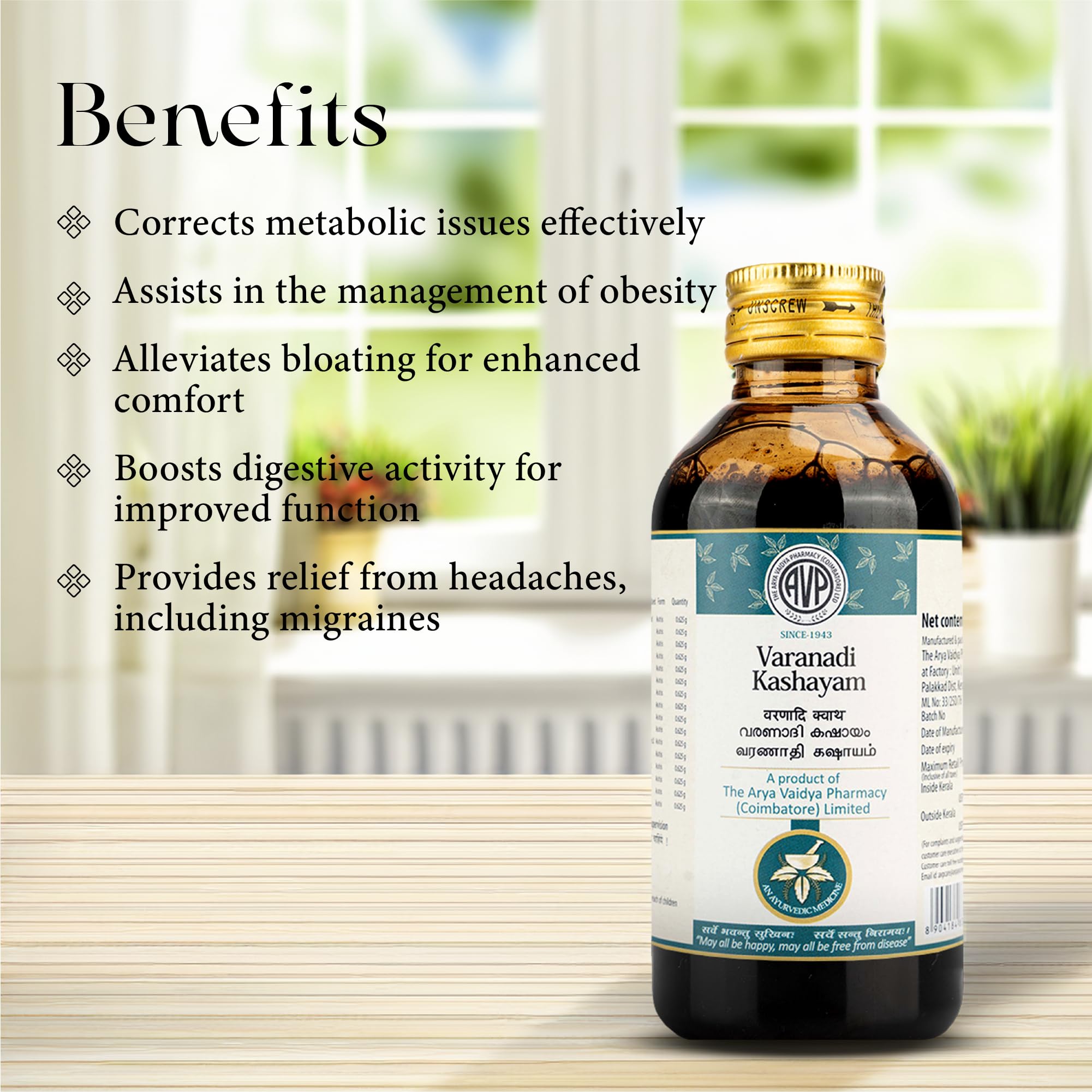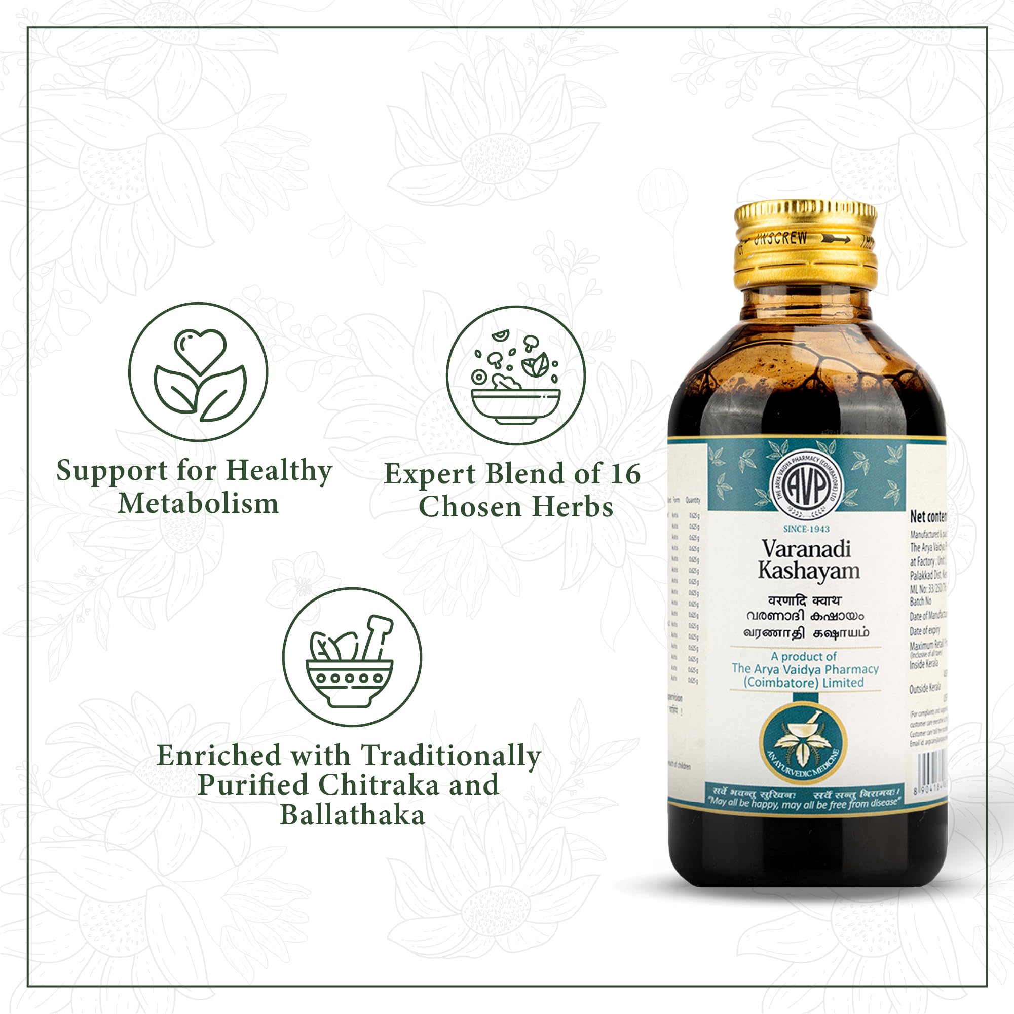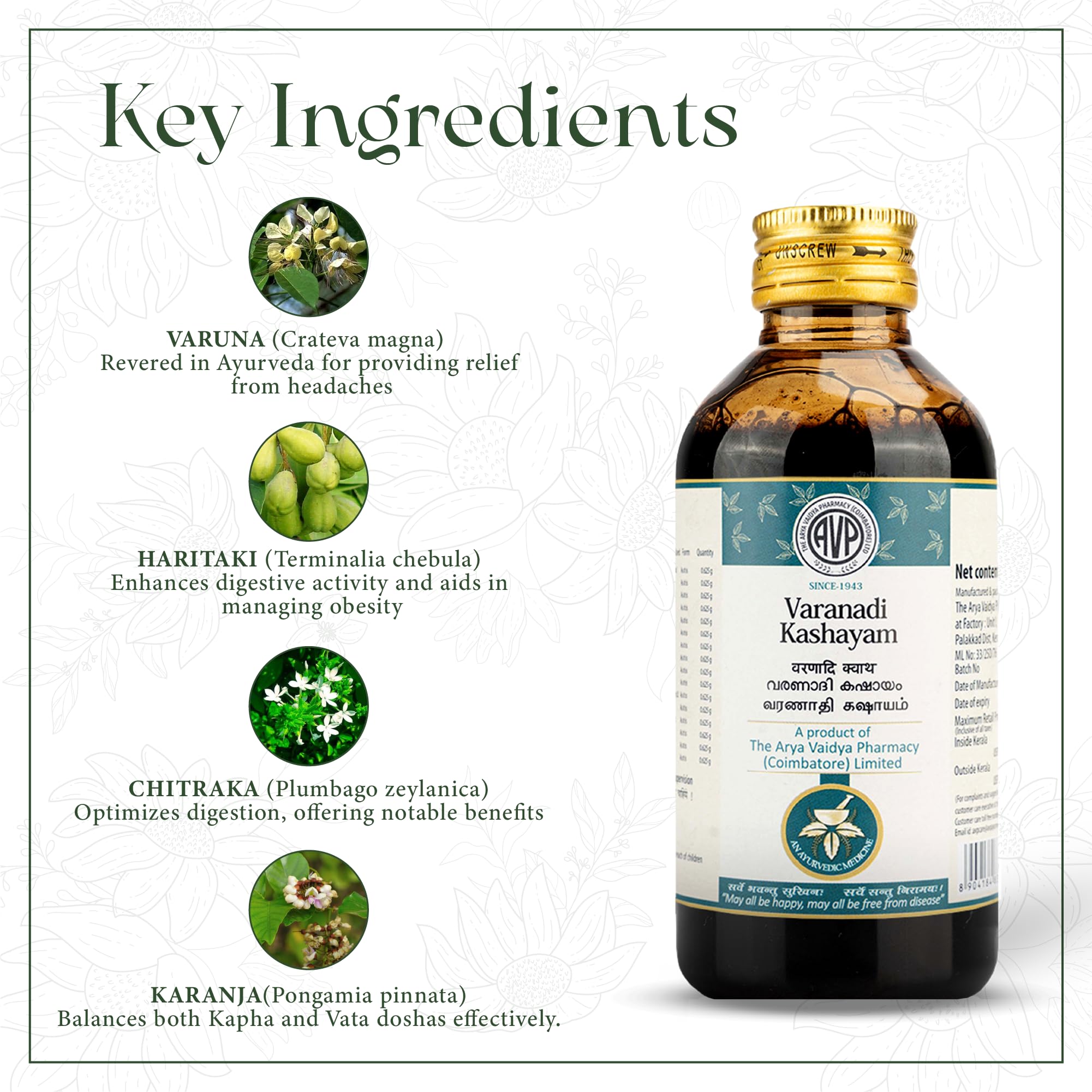 Varanadi Kashayam is a traditional ayurvedic medicine which is time tested formulation made with safe herbs and authentic ayurvedic products from the house of AVP. It is made up of ayurvedic products Varuna Sairyaka and Sathavari which is effective in managing the symptoms of dyspepsia and arthritis and effective in the management of inflamamtory arthritis. Varnadi Kashayam is cruelty free and not tested on animals.