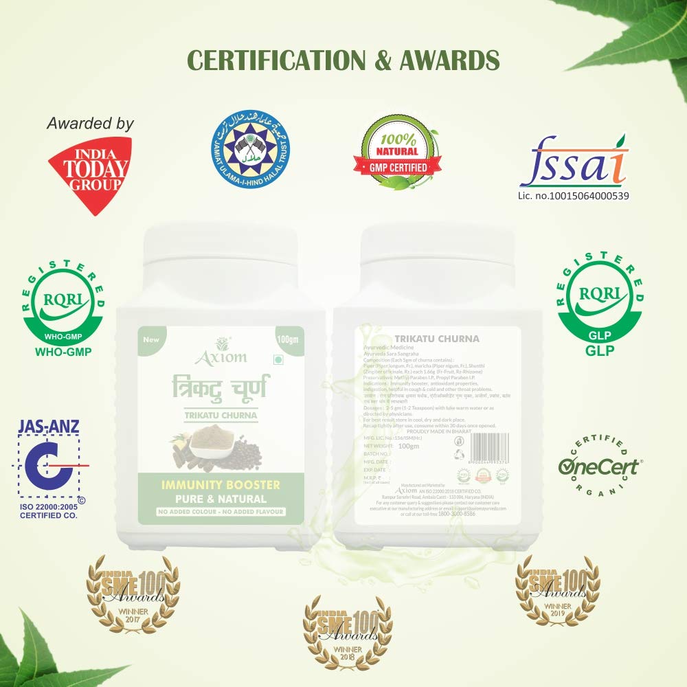 CERTIFICATION AND USES: Axiom Trikatu churan is 100% Natural WHO GMP GLP certified Mix 2 teaspoons of Axiom Trikatu churan with 2 teaspoons of honey. Have it three to four times a day for immediate and effective results or as directed by physician.