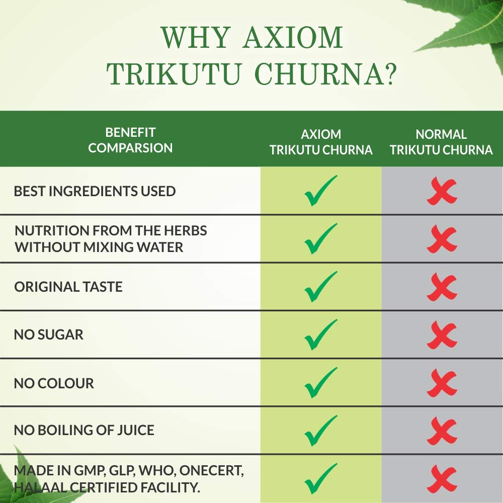 IMMUNITY BOOSTER: Axiom Trikatu churan helps in improving the immunity.It aids in improving the digestion by increasing the fire elements in the body that helps in proper digestion and increase appetite.