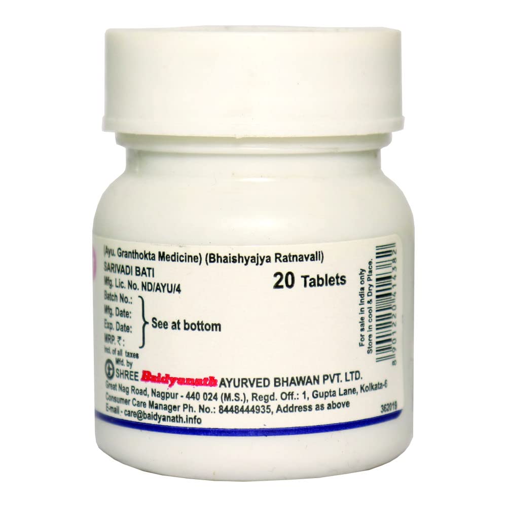 Baidyanath Asli Ayurved Sarivadi Bati is a classical Ayurvedic supplement formulated using time-tested herbal ingredients. Rooted in ancient Ayurvedic wisdom this blend includes Sariva (Hemidesmus indicus) Triphala and other carefully selected herbs. Traditionally used in Ayurveda this herbal supplement is designed to support overall well-being when taken as part of a balanced lifestyle.Crafted with purity in mind Sarivadi Bati is made using high-quality plant-based ingredients and does not contain artificial additives synthetic preservatives or harmful chemicals. It is a natural choice for those seeking an Ayurvedic supplement that aligns with traditional wellness practices. This herbal formulation is prepared following ancient texts to ensure its effectiveness and authenticity. For best results it is recommended to take Baidyanath Sarivadi Bati under the guidance of a healthcare professional. Incorporating this Ayurvedic supplement into a healthy daily routine can be beneficial in maintaining overall wellness.