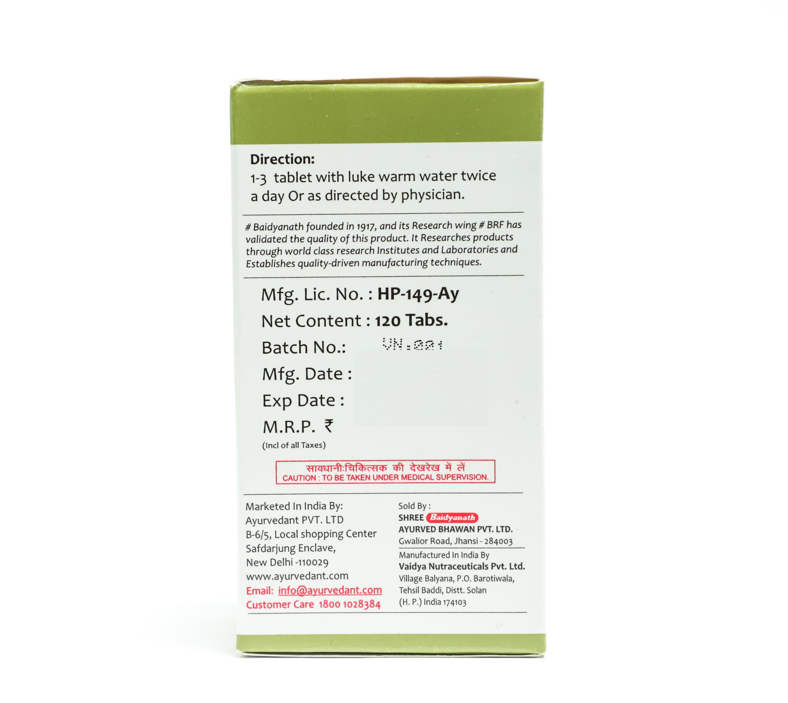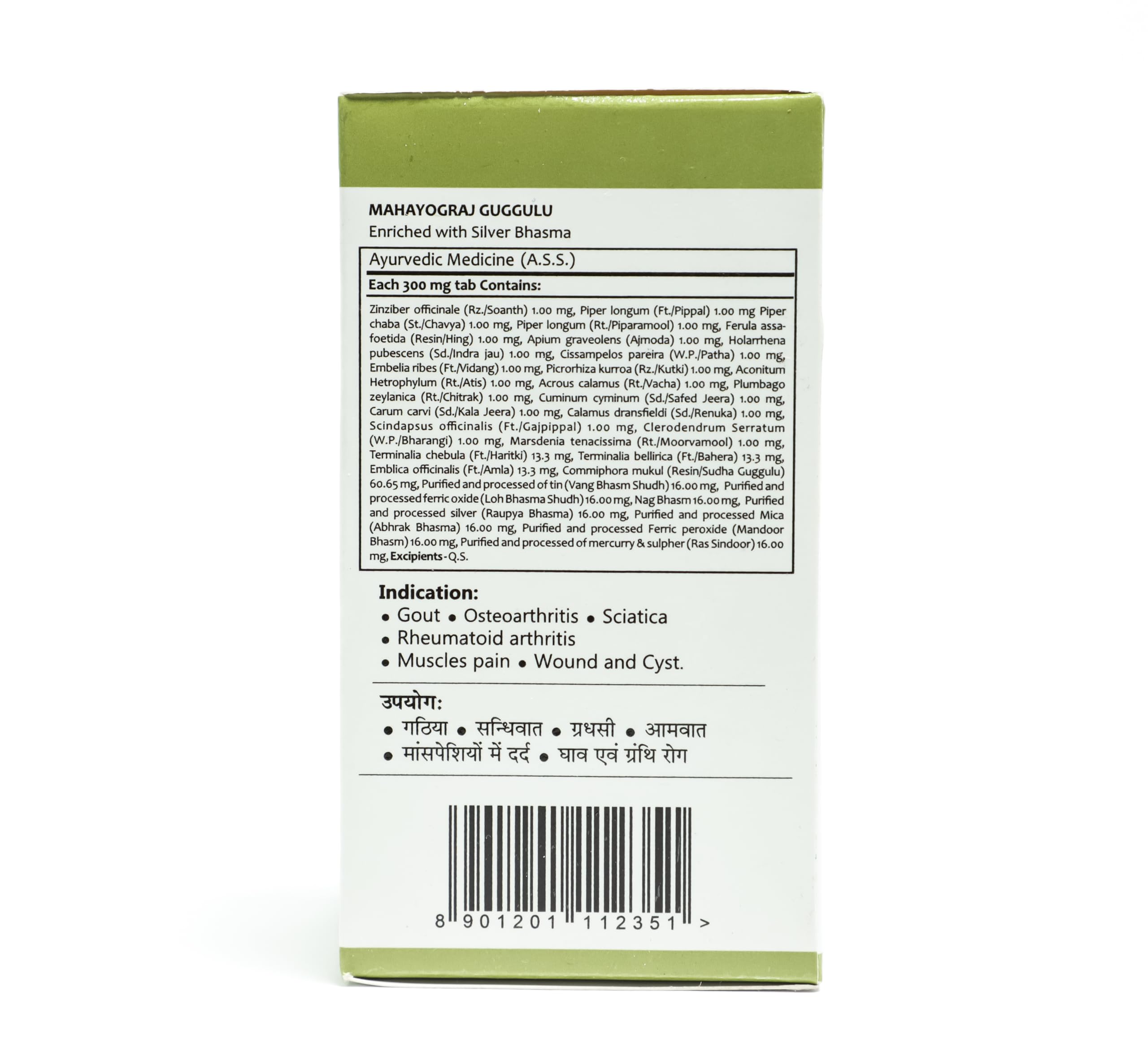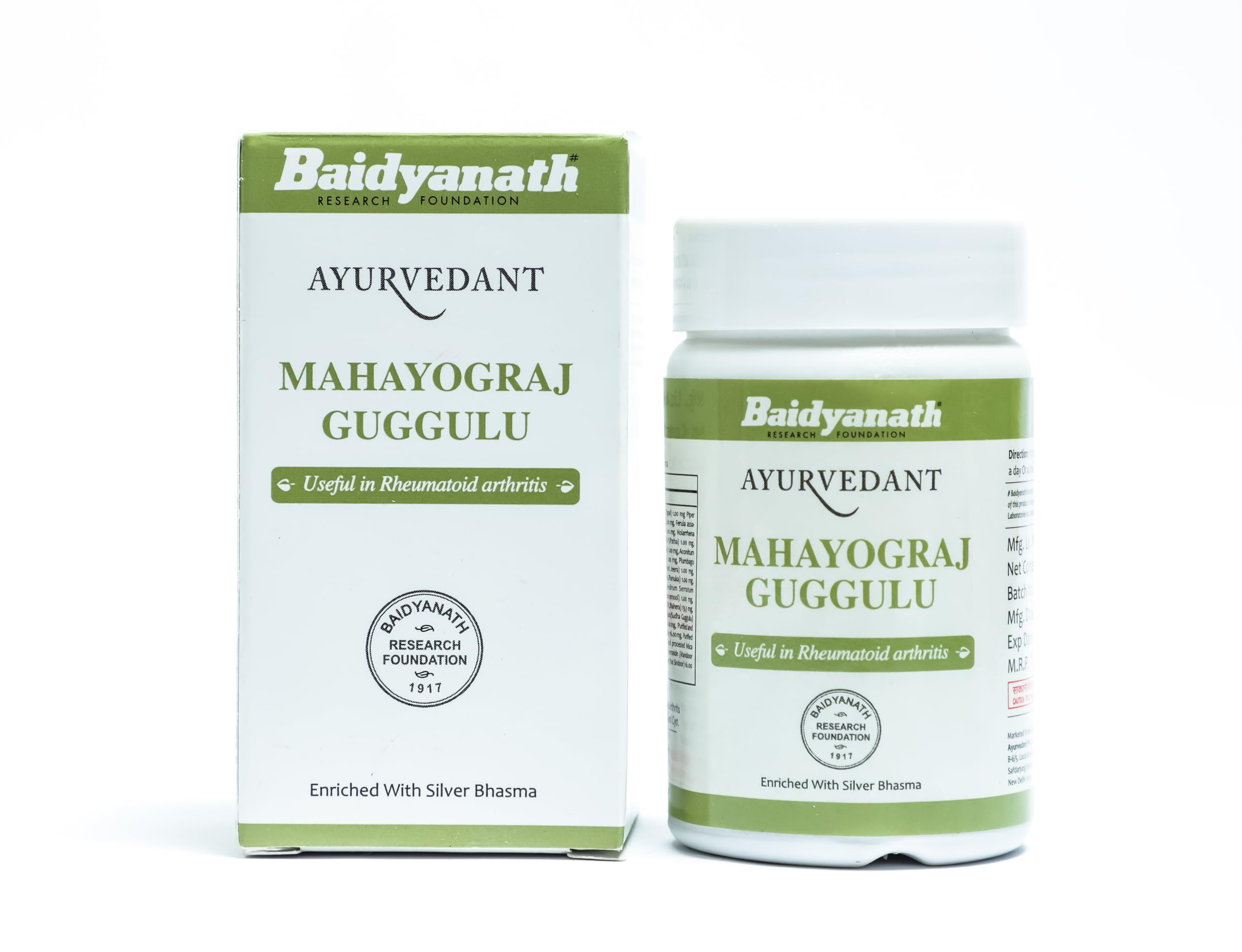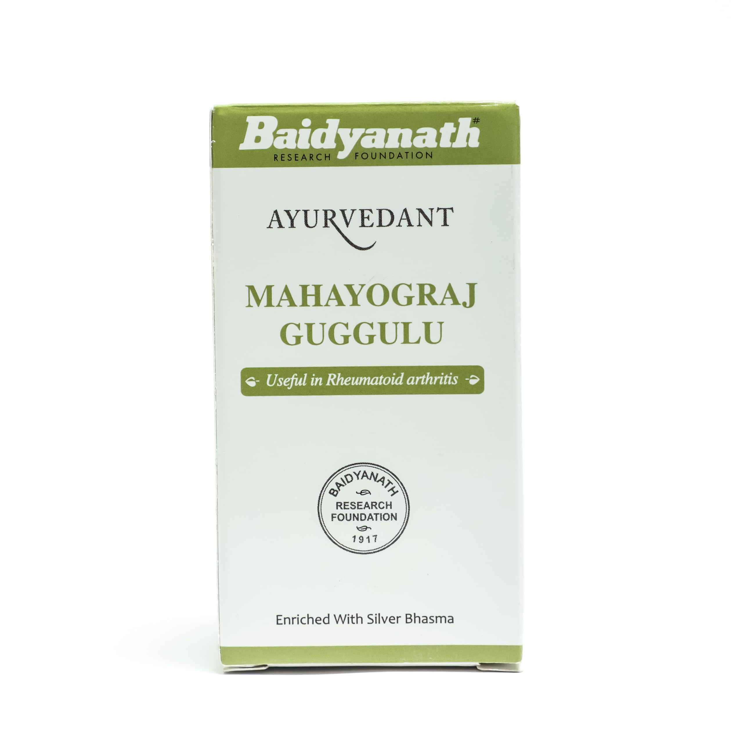 Introducing Ayurvedant Mahayograj Guggulu Tablet â your trusted companion for holistic wellness derived from ancient Ayurvedic wisdom. Key Features: Traditional Formulation: Crafted with a blend of potent Ayurvedic herbs including Guggulu Triphala and Trikatu this tablet encapsulates centuries-old wisdom for overall well-being. Joint Support: Mahayograj Guggulu is renowned in Ayurveda for its supportive role in promoting joint health and mobility. It may help maintain the natural flexibility and comfort of your joints. Digestive Harmony: This tablet aids in promoting healthy digestion and metabolism fostering a balanced digestive system essential for overall vitality and wellness. Detoxification: Mahayograj Guggulu tablet supports the body's natural detoxification processes helping to eliminate toxins and promote optimal organ function. Immune Boost: With its rejuvenating properties this tablet may also contribute to enhancing immune function supporting the body's natural defenses. How to Use: Take 1-2 tablets twice daily with warm water or as directed by your healthcare provider. For best results continue regular use as part of a balanced lifestyle.