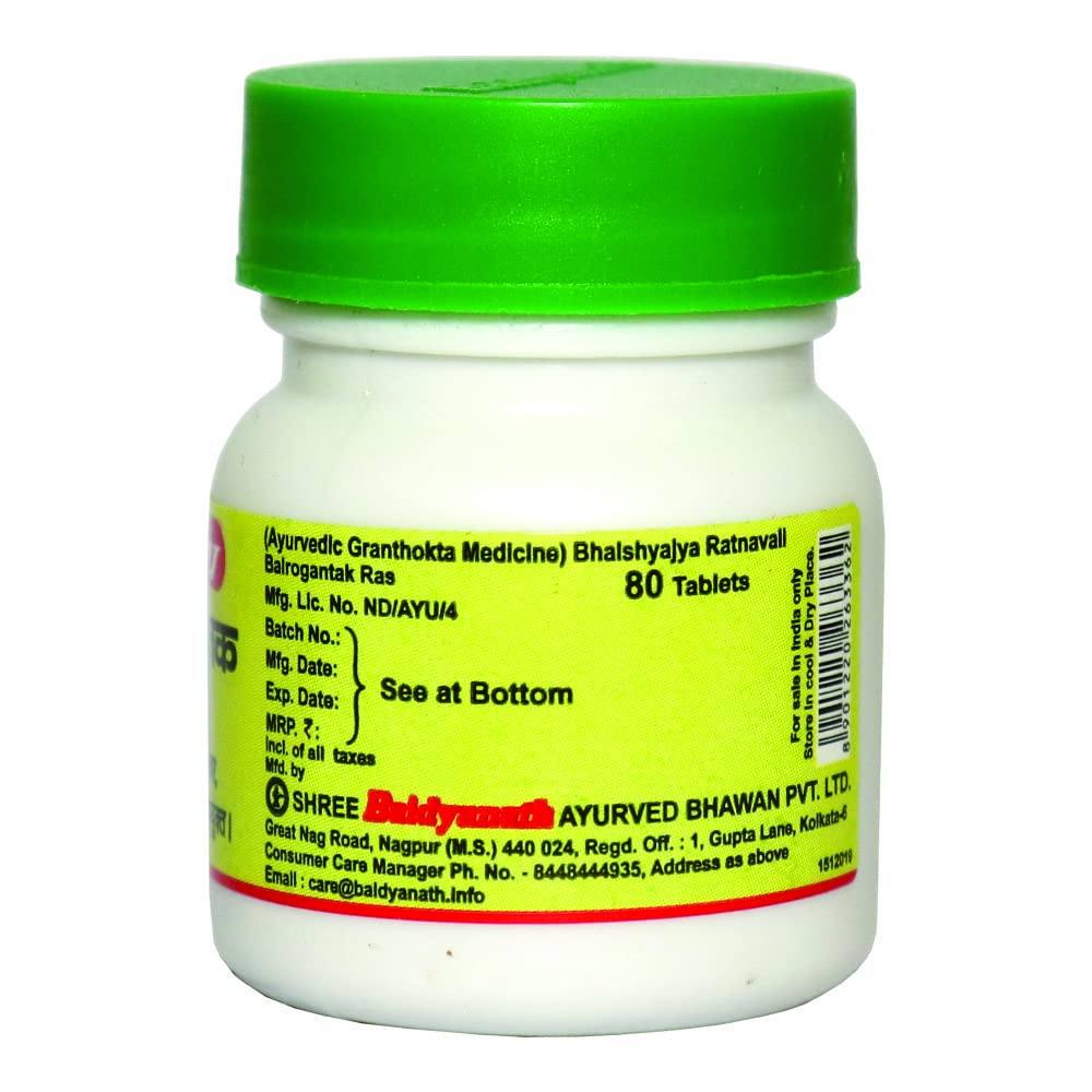 Baidyanath Balrogantak Ras-80 Tab (Pack Of 2). One of India;s most respected Companies Shree Baidyanath Ayurved Bhawan Pvt. Ltd. (Nagpur) popularly known as Baidyanath is the acknowledged leader of Ayurvedic know-how. Established in 1917 the Company has played a pioneering role in re-establishing ancient knowledge with modern research and manufacturing techniques. AYURVEDA is a 5000 year old Science of health care and herbal treatment. AYURVEDA is highly effective in common and complicated ailments assures long term relief and has no side effects. AYURVEDA is now backed by modern scientific research and technologies and provides its gentle healing touch to millions around the world.