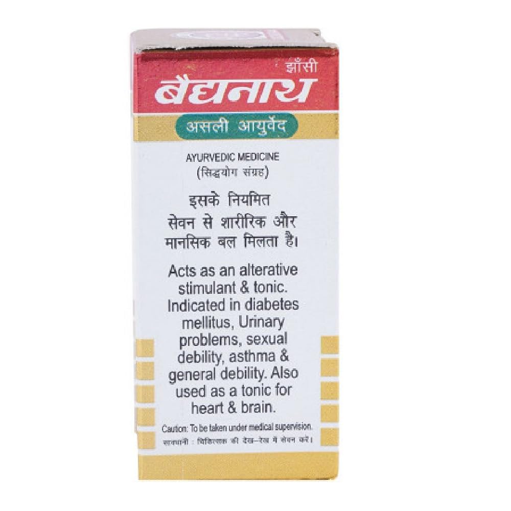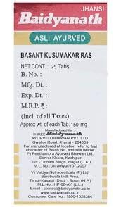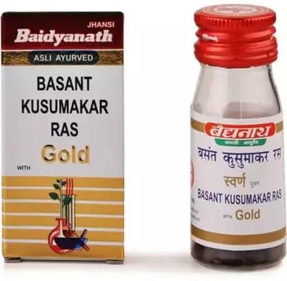 General Benefits Baidyanath Basantkusmakar Ras (S.C.M.Yu) is an ayurvedic medicine that contains Gold Silver & Pearl. It helps in maintaining good blood glucose level contolling Sugar and treating debility of heart and brain. It is also very effective in urinary infections Men's debility phthisis asthma and general weakness. It can also be used to treat general weakness Men's debility and urinary infections. Therapeutic Uses Acts as an alterative stimulant & tonic. Indicated in Sugar mellitus Sugar-insipidus urinary affections Men's debility phthisi asthma leucorrhoea diuresis & general debility. Also used as a tonic for heart & brain. Ingredients Prawal Bhasma Chandrodaya or Ras Sindoor Moti Pishti Abhrak Bhasma Raupya Bhasma Suvarna Bhasma Shatavari Adulasa Swaras Ganna Kamal Ke Phool Mahuti Ke Phool Kadali Kanda Malati Phool Chandan Kasturi. Dosage 1 Tab. with water twice a day or as directed by Physician. Ayurvedic Reference Sidh Yog Samgrah Detailed Description Baidyanath (Jhansi) Basant Kusumakar Ras with Gold Tablet is an excellent Ayurvedic remedy for the management of high blood sugar levels and diabetes. This product has properties that are effective in protecting the body from various problems such as polyuria caused due to diabetes. It protects and nourishes the body and helps build strength. Key Ingredients: Prawal Pisti Ras Sindoor Sudh Parad Sudh Gandhak Ras Karpur Sudh Sankhaiya Moti Pisti Abhrak Bhasm Chandi Bhasm Swarn Bhasm Lauh Bhasm Nag Bhasm Good to Know: Basant Kusumakar Ras with Gold Tablet is formulated with a blend of potent Ayurvedic ingredients known for their therapeutic properties in managing diabetes and related complications. Ideal For: Suitable for individuals diagnosed with diabetes and experiencing symptoms such as polyuria weakness and related complications. Key Benefits: Provides effective protection from the belittling effects of diabetes Keeps the body strong and prevents weakness Helpful in urinary problems produced due to diabetes such as polyuria Directions For Use: 1-2 tablets (125-250 mg) twice daily with honey or milk or as directed by an Ayurvedic practitioner Safety Information: Store the formulation in cool and dry place Read the label carefully before use Description: Vasant Kusumakar Ras or Basant Kusumakar Ras is comination of herbs mineral and metallic or Ras Aushadhi of Ayurveda. It is a Rasayan or tonic.The name of this medicine signifies as the spring (Vasant) causes blossom (Kusum) in the plant similarly intake of this medicine may give strength to your body. It may also be useful for good complexion and may gives glow to skin. It is beneficial in High Blood Sugar level and for early ageing process. Vasant Kusumakar Ras is especially useful in many reproductive disorders of both male and female.