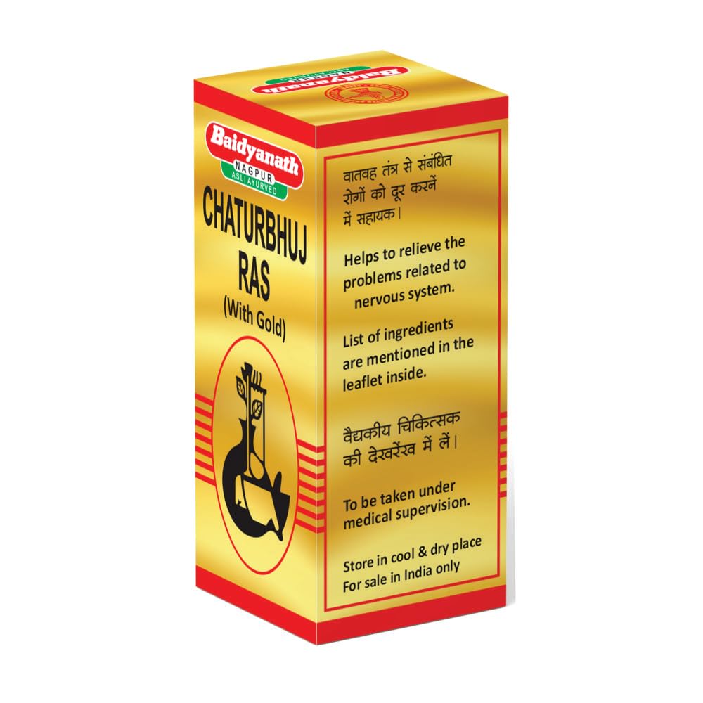 Baidyanath Chaturbhuja Ras Say -10 Tablets. One of Indiaâs most respected Companies Shree Baidyanath Ayurved Bhawan Pvt. Ltd. (Kolkata) popularly known as Baidyanath is the acknowledged leader of Ayurvedic know-how. Established in 1917 the Company has played a pioneering role in re-establishing ancient knowledge with modern research and manufacturing techniques. AYURVEDA is a 5000 year old Science of health care and herbal treatment. AYURVEDA is highly effective in common and complicated ailments assures long term relief and has no side effects. AYURVEDA is now backed by modern scientific research and technologies and provides its gentle healing touch to millions around the world.
