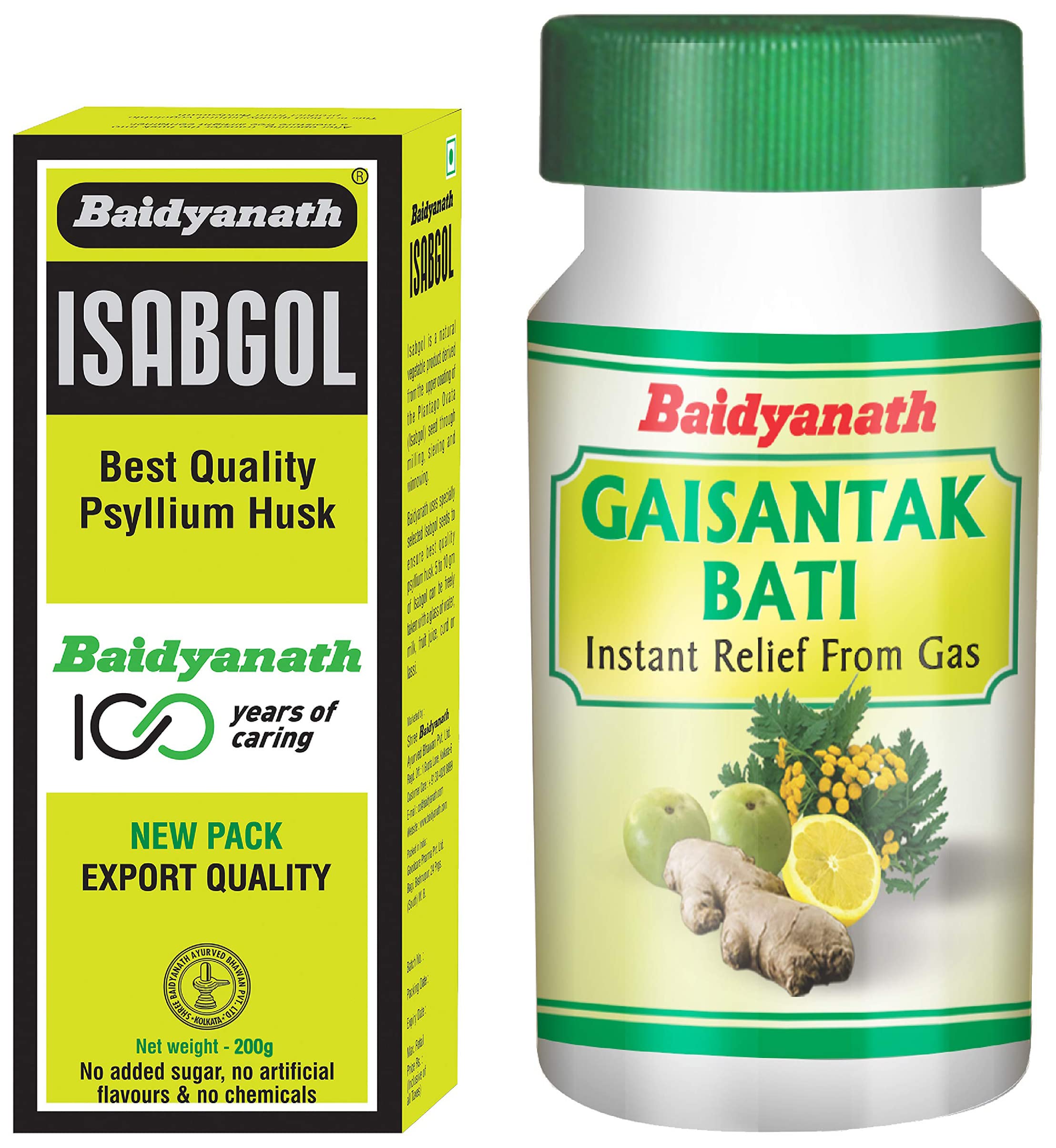 Baidyanath Gaisantak Bati - Instant Relief from Gas and Indigestion - 100 Tablets (Pack of 2)Baidyanath Gaisantak Bati is a traditional Ayurvedic formulation made from commonly known herbs known to provide quick relief from digestive distress like gas hyperacidity flatulence and bloating. It contains household herbs and spices like Ajwain Ginger Hing and Kala Namak that are also known to help elevate your immunity and energy levels. Consume 1 to 2 tabets twice a day post your meals or as directed by the Ayurvedic practioner.Baidyanath Vansaar Isabgol - Psyllium Husk Powder - 200gm | Effectively Relieves Constipation | Fibre Supplement For DigestionBaidyanath lsabgol (also known as Psyllium husk) is a natural vegetable product derived from the upper coating of Plantago Ovata seeds after through milling sieving and winnowing. Isabgol helps in maintaining a healthy digestive tract and relieves constipation and digestive distress. Baidyanath uses specially selected lsabgol seeds to ensure only the best quality psyllium husk is produced. It is a rich source of fibre and is gluten-free.