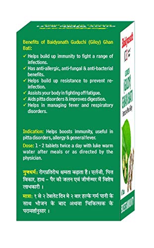 HELPS IN BALANCING PITTA: Giloy is beneficial for easing pitta imbalances like burning sensation of hand and feet allergy skin inflammation and acidity. Thus Baidyanath Giloy Ghan Bati aims to bring a balance of the 3 doshas of the body.