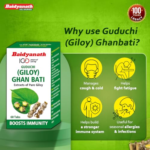 Design:Giloy Ghan Bati 120 TabsBaidyanath Giloy Ghan Bati is beneficial for easing pitta imbalances like the burning sensation of hand and feet allergic reactions skin and acidity. Baidyanath Giloy Ghan Bati is solely made up with ¢Giloy also known as Guduchi a popular herb in the ayurvedic world. It has been used in ancient herbal mediciines and is known for its anti-arthritic antipyretic deigestive anti-inflamtory iron ting properties.
