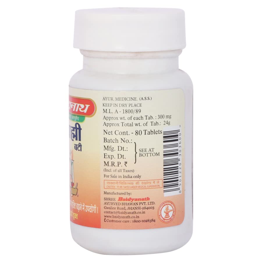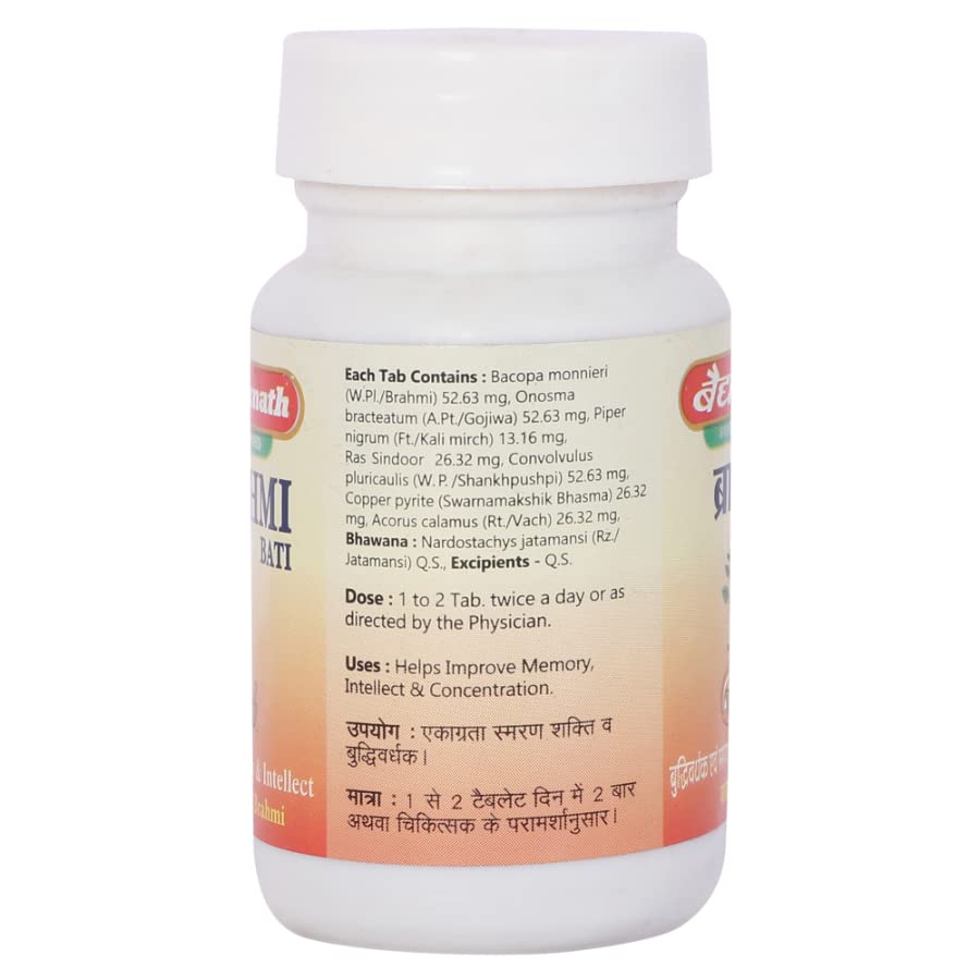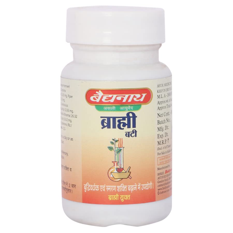 Baidyanath (Jhansi) Brahmi Bati active contains BrahmiSankhapuspi (Evolvulus alsinoides) Marica (Piper nigrum)Svarnamaksika bhasma (Calcinated and purified copper pyrites)Rasa sinduraGava java. Brahmi Bati is the superior Suvarnakalpa with excellent Medhya Mastishkabalya & Rasayan Dravyas like Brahmi & Suvarna Bhasma. It may relieves mental stress & fatigue with the Balya & Shamak action on Mastishka & Sanjnyavahi nadis. Enhances the capacity of sensory as well as motor organs & promotes intelligence & memory.Brahmi Bati may useful in Unmada Apasmar Bhrama Akshepak Manodaurbalya Insomnia Smrutimandya Mental stress Anxiety fatigue.
