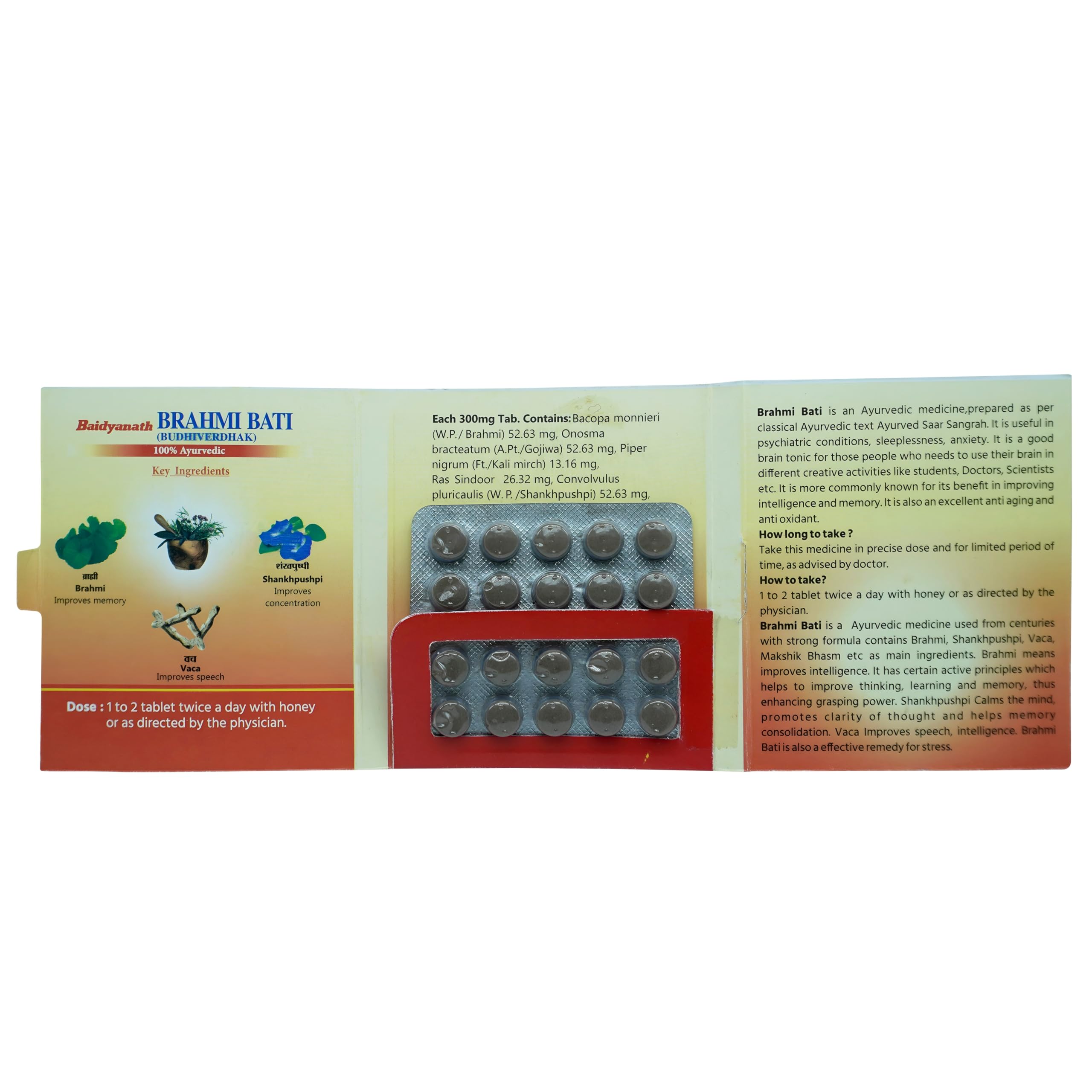 Baidyanath (Jhansi) Brahmi Bati active contains BrahmiSankhapuspi (Evolvulus alsinoides) Marica (Piper nigrum)Svarnamaksika bhasma (Calcinated and purified copper pyrites)Rasa sinduraGava java. Brahmi Bati is the superior Suvarnakalpa with excellent Medhya Mastishkabalya & Rasayan Dravyas like Brahmi & Suvarna Bhasma. It may relieves mental stress & fatigue with the Balya & Shamak action on Mastishka & Sanjnyavahi nadis. Enhances the capacity of sensory as well as motor organs & promotes intelligence & memory. Brahmi Bati may useful in Unmada Apasmar Bhrama Akshepak Manodaurbalya Insomnia Smrutimandya Mental stress Anxiety fatigue.