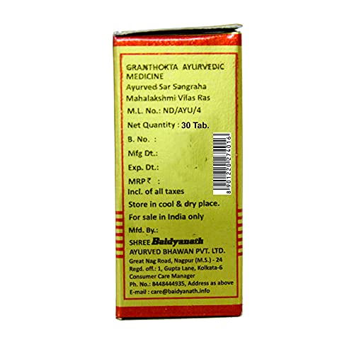 Baidyanath Mahalaxmivilas Ras with Gold - 30 Tablets. One of Indiaâs most respected Companies Shree Baidyanath Ayurved Bhawan Pvt. Ltd. (Kolkata) popularly known as Baidyanath is the acknowledged leader of Ayurvedic know-how. Established in 1917 the Company has played a pioneering role in re-establishing ancient knowledge with modern research and manufacturing techniques. AYURVEDA is a 5000 year old Science of health care and herbal treatment. AYURVEDA is highly effective in common and complicated ailments assures long term relief and has no side effects. AYURVEDA is now backed by modern scientific research and technologies and provides its gentle healing touch to millions around the world.