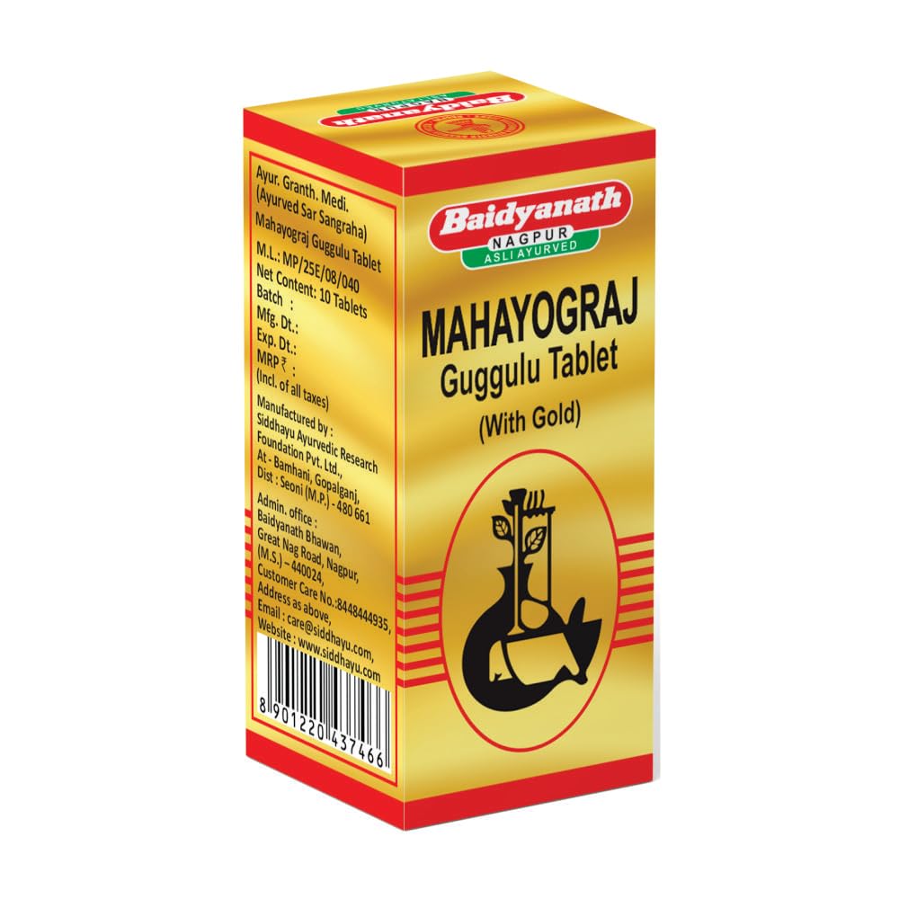 Baidyanath Mahayograj Guggulu Swyu -10 Tablets. One of Indiaâs most respected Companies Shree Baidyanath Ayurved Bhawan Pvt. Ltd. (Kolkata) popularly known as Baidyanath is the acknowledged leader of Ayurvedic know-how. Established in 1917 the Company has played a pioneering role in re-establishing ancient knowledge with modern research and manufacturing techniques. AYURVEDA is a 5000 year old Science of health care and herbal treatment. AYURVEDA is highly effective in common and complicated ailments assures long term relief and has no side effects. AYURVEDA is now backed by modern scientific research and technologies and provides its gentle healing touch to millions around the world.