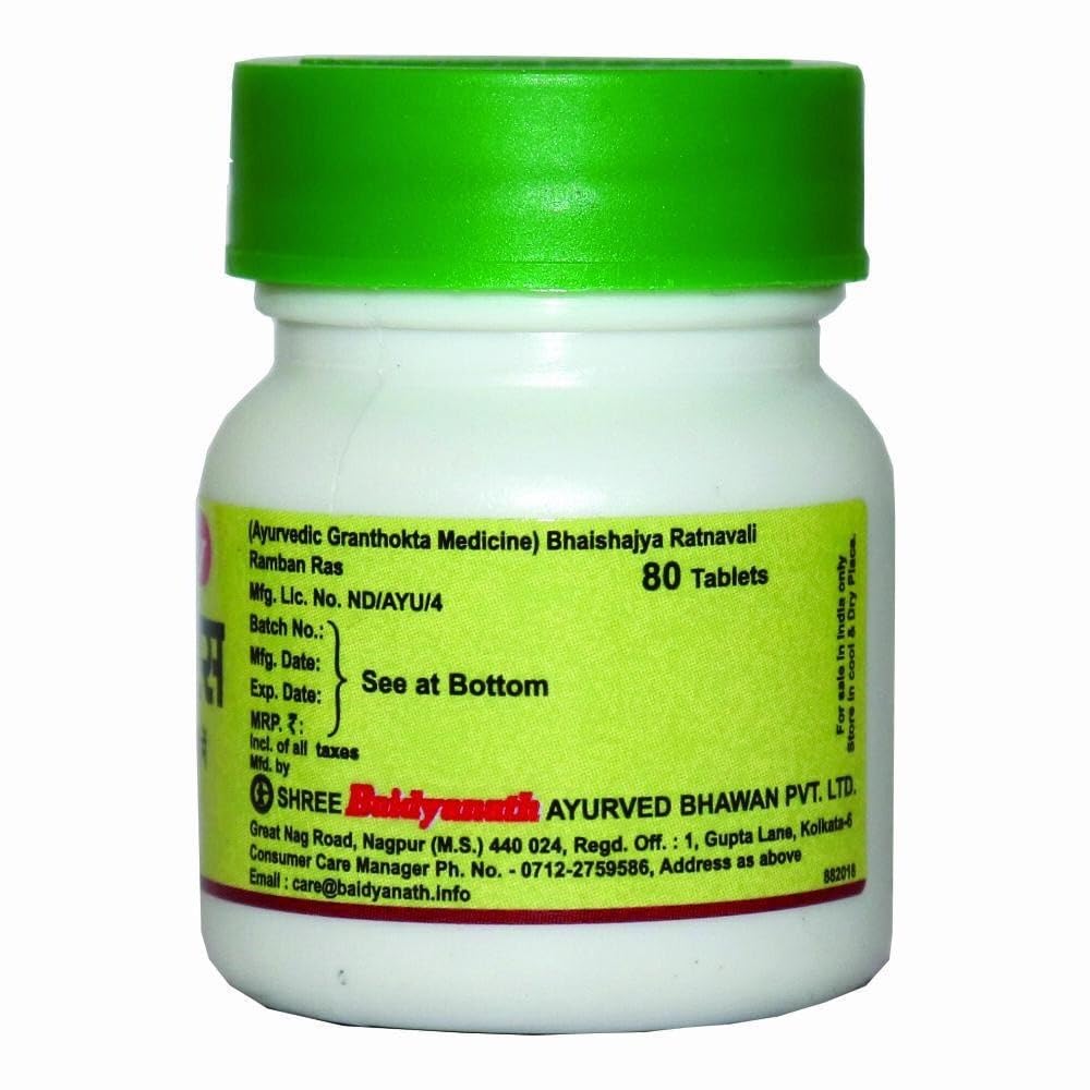 Baidyanath Ramban Ras-80 Tab (Pack Of 2). One of India;s most respected Companies Shree Baidyanath Ayurved Bhawan Pvt. Ltd. (Nagpur) popularly known as Baidyanath is the acknowledged leader of Ayurvedic know-how. Established in 1917 the Company has played a pioneering role in re-establishing ancient knowledge with modern research and manufacturing techniques. AYURVEDA is a 5000 year old Science of health care and herbal treatment. AYURVEDA is highly effective in common and complicated ailments assures long term relief and has no side effects. AYURVEDA is now backed by modern scientific research and technologies and provides its gentle healing touch to millions around the world.