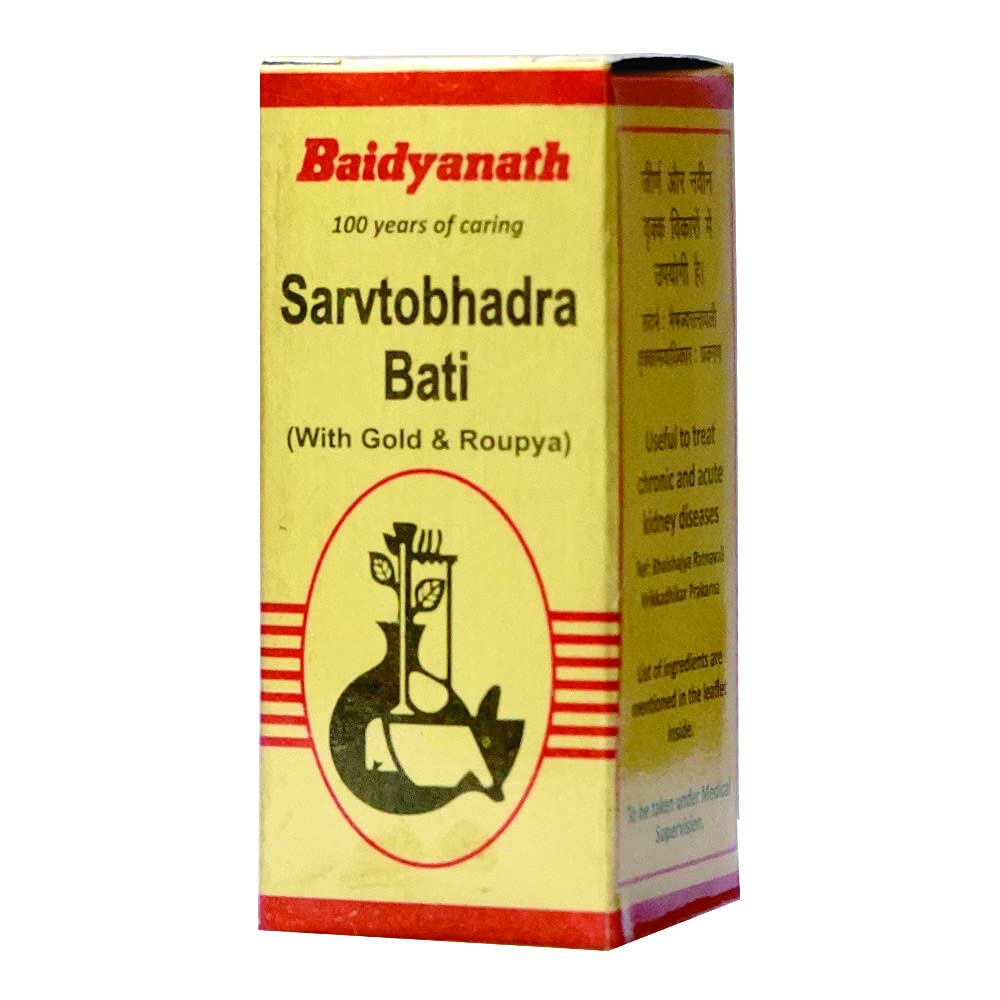 Baidyanath Sarvtobhadra Bati (With Gold & Roupya) Kidney Health Support - 5 Tablets. One of Indiaâs most respected Companies Shree Baidyanath Ayurved Bhawan Pvt. Ltd. (Kolkata) popularly known as Baidyanath is the acknowledged leader of Ayurvedic know-how. Established in 1917 the Company has played a pioneering role in re-establishing ancient knowledge with modern research and manufacturing techniques. AYURVEDA is a 5000 year old Science of health care and herbal treatment. AYURVEDA is highly effective in common and complicated ailments assures long term relief and has no side effects. AYURVEDA is now backed by modern scientific research and technologies and provides its gentle healing touch to millions around the world.