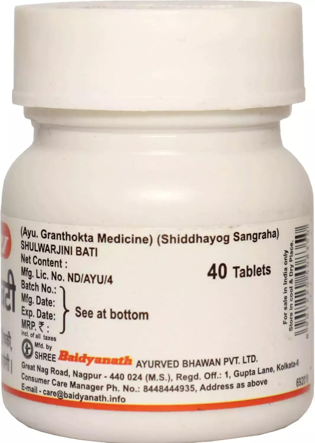 Baidyanath Shulwarjini Bati-40 Tab (Pack Of 2). One of India;s most respected Companies Shree Baidyanath Ayurved Bhawan Pvt. Ltd. (Nagpur) popularly known as Baidyanath is the acknowledged leader of Ayurvedic know-how. Established in 1917 the Company has played a pioneering role in re-establishing ancient knowledge with modern research and manufacturing techniques. AYURVEDA is a 5000 year old Science of health care and herbal treatment. AYURVEDA is highly effective in common and complicated ailments assures long term relief and has no side effects. AYURVEDA is now backed by modern scientific research and technologies and provides its gentle healing touch to millions around the world.