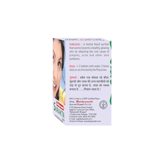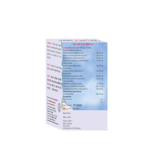 Ingredients: Manjit(Rubia cordifolia)Bahera(Terminalia belerica)Amla(Emblica officinalis)Daru haldi(Berberis aristata)Neem chhal(Azadirachta indica)Gorkmundi(Sphaeranthus indicus)Anantmool(Hemidesmus indicus)Kutki (Picrorhiza kurroa)Ashwagandha(Withania somnifera)Chop Chini(Smilax china) Haritaki (Terminalia chebula)Sudh GandhakGum Acacia (Excipients)Talcum (Excipients)