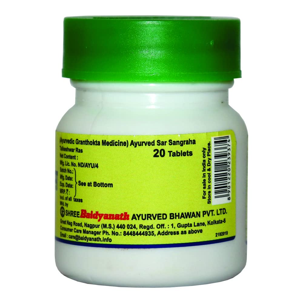 Baidyanath Tarkeshwar Ras-20 Tab (Pack Of 2). One of India;s most respected Companies Shree Baidyanath Ayurved Bhawan Pvt. Ltd. (Nagpur) popularly known as Baidyanath is the acknowledged leader of Ayurvedic know-how. Established in 1917 the Company has played a pioneering role in re-establishing ancient knowledge with modern research and manufacturing techniques. AYURVEDA is a 5000 year old Science of health care and herbal treatment. AYURVEDA is highly effective in common and complicated ailments assures long term relief and has no side effects. AYURVEDA is now backed by modern scientific research and technologies and provides its gentle healing touch to millions around the world.