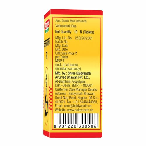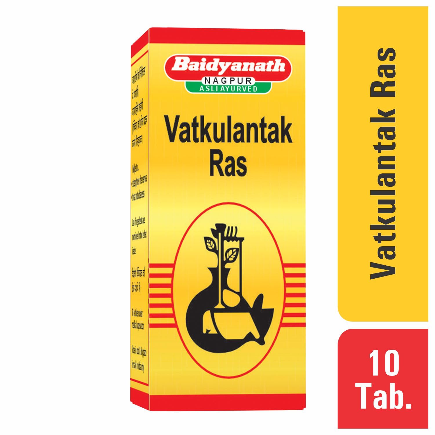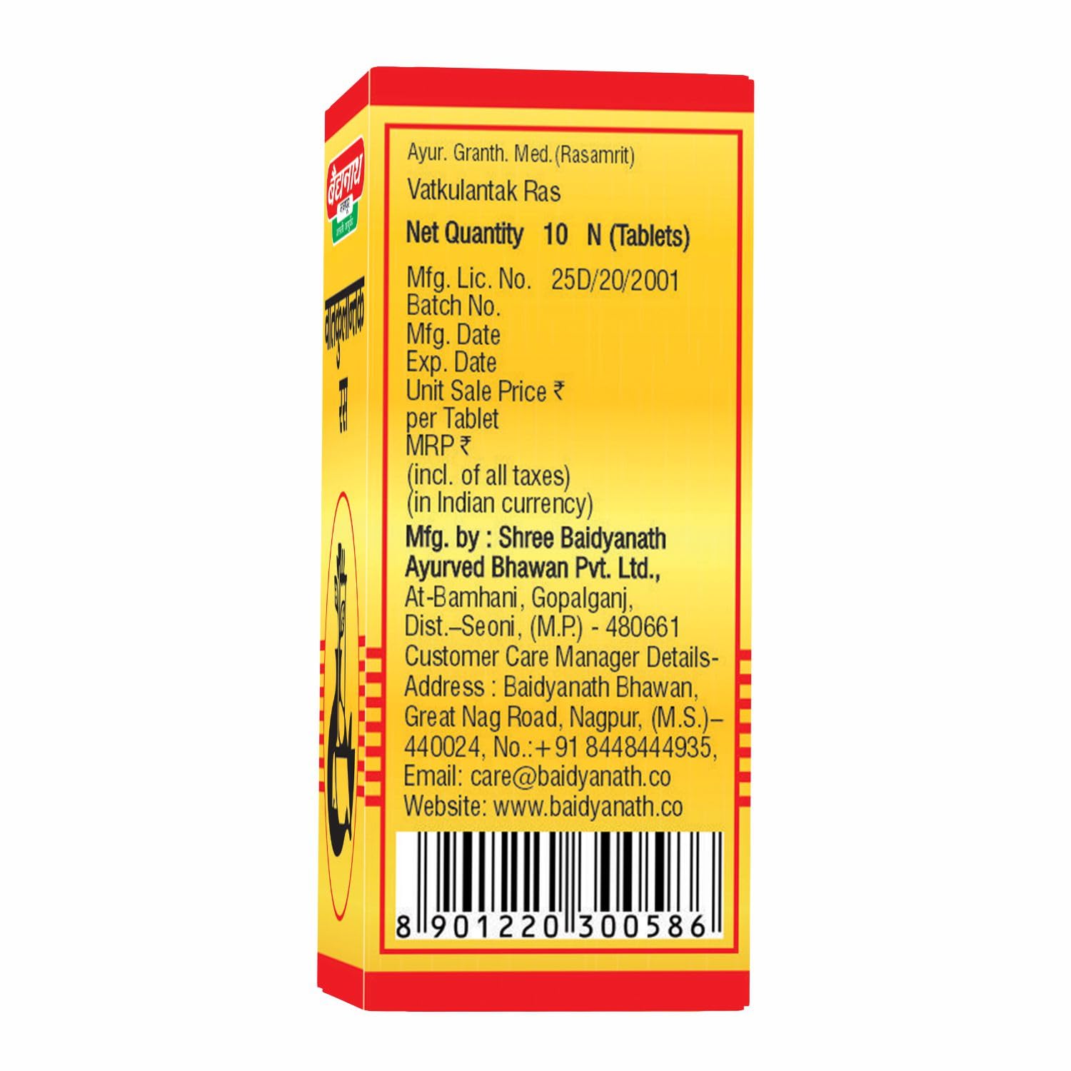 Baidyanath Vatakulantak Ras - 10 Tablets. One of Indiaâs most respected Companies Shree Baidyanath Ayurved Bhawan Pvt. Ltd. (Kolkata) popularly known as Baidyanath is the acknowledged leader of Ayurvedic know-how. Established in 1917 the Company has played a pioneering role in re-establishing ancient knowledge with modern research and manufacturing techniques. AYURVEDA is a 5000 year old Science of health care and herbal treatment. AYURVEDA is highly effective in common and complicated ailments assures long term relief and has no side effects. AYURVEDA is now backed by modern scientific research and technologies and provides its gentle healing touch to millions around the world.