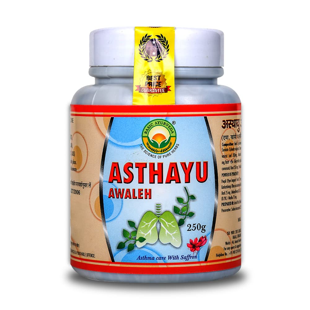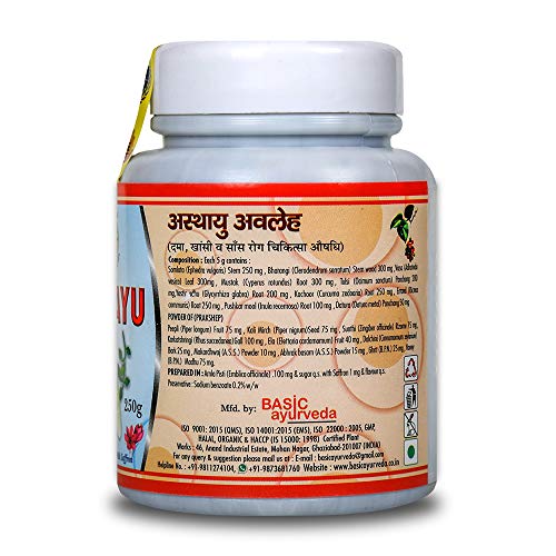 • Basic Ayurveda Asthayu Awaleh is a blend of ayurvedic herbs that provide ease for all types of respiratory conditions. The herbs present in the Asthayu Awaleh are effective in managing the common cold and stuffy nose.