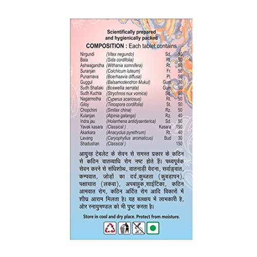 Benefits Ayurh tablet it may help in Sandhisoth it may help in Aamvat it may help Vat Vyadhi it may help Helpful in Vat roga.