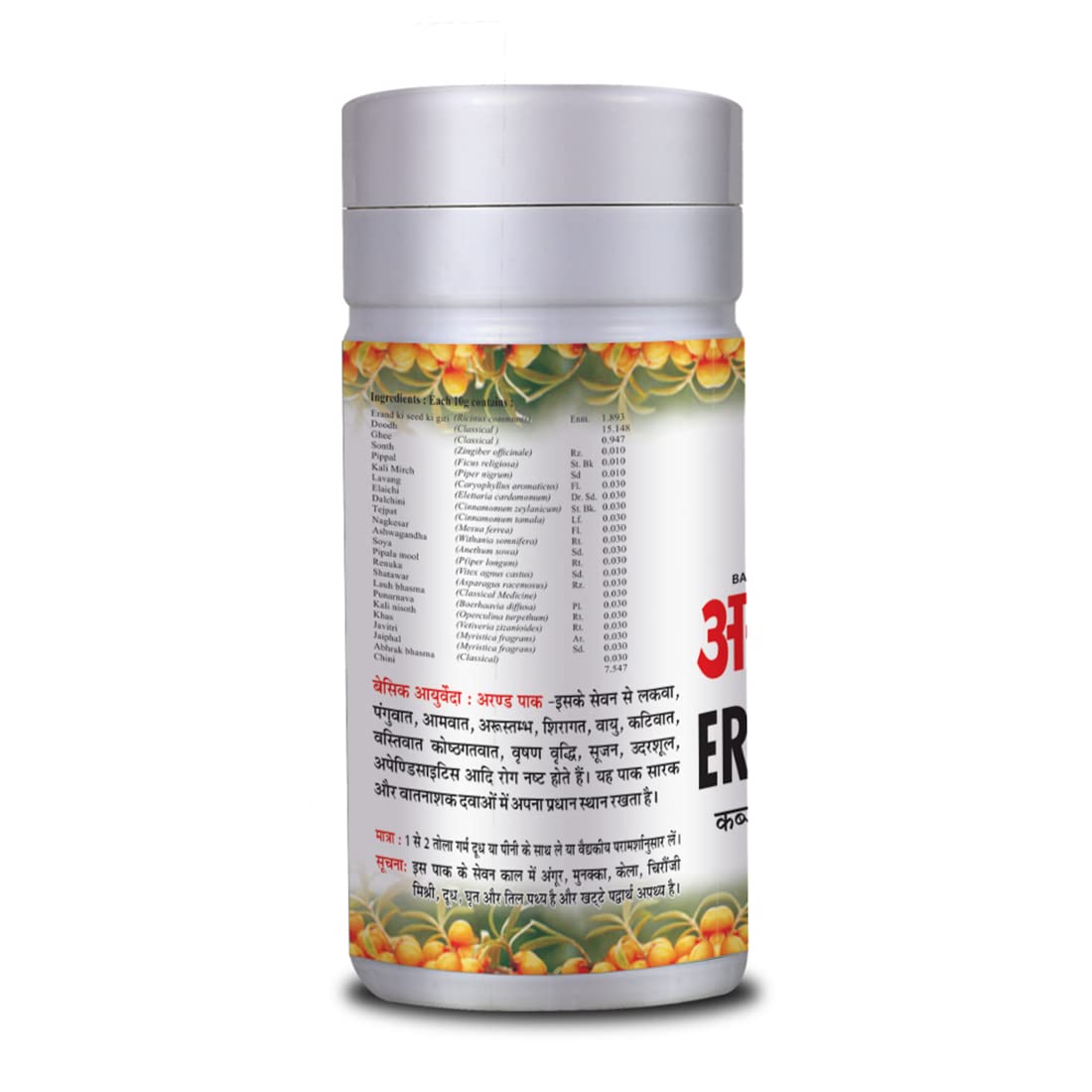 • Erand Pak churna contains a potent combination of the ingredients Erand ki seed ki Giri Doodh Ghee Trikatu Lavang Elaichi Dalchini Tejpat Nagkesar Ashwagandha Soya Pipala mool Renuka Shatawar Lauh Bhasma Punarnava Nisoth and other prominent herbs.