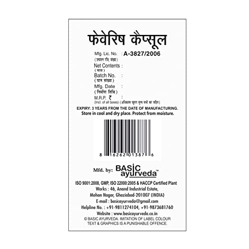 • Basic Ayurveda Feverish Capsule is an ayurvedic formulation of a capsule. The capsule is composed of herbs and extracts that are in nature and help to bring down the temperature.