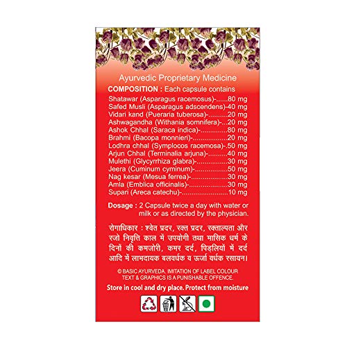 • It is a combination of herbal ingredients Shatawar Safed Musli Vidari Kand Ashwagandha Ashok Chhal Brahmi Lodhra Chhal Arjuna Chhal Mulethi Jeera Naag Kesar Amla Supari.