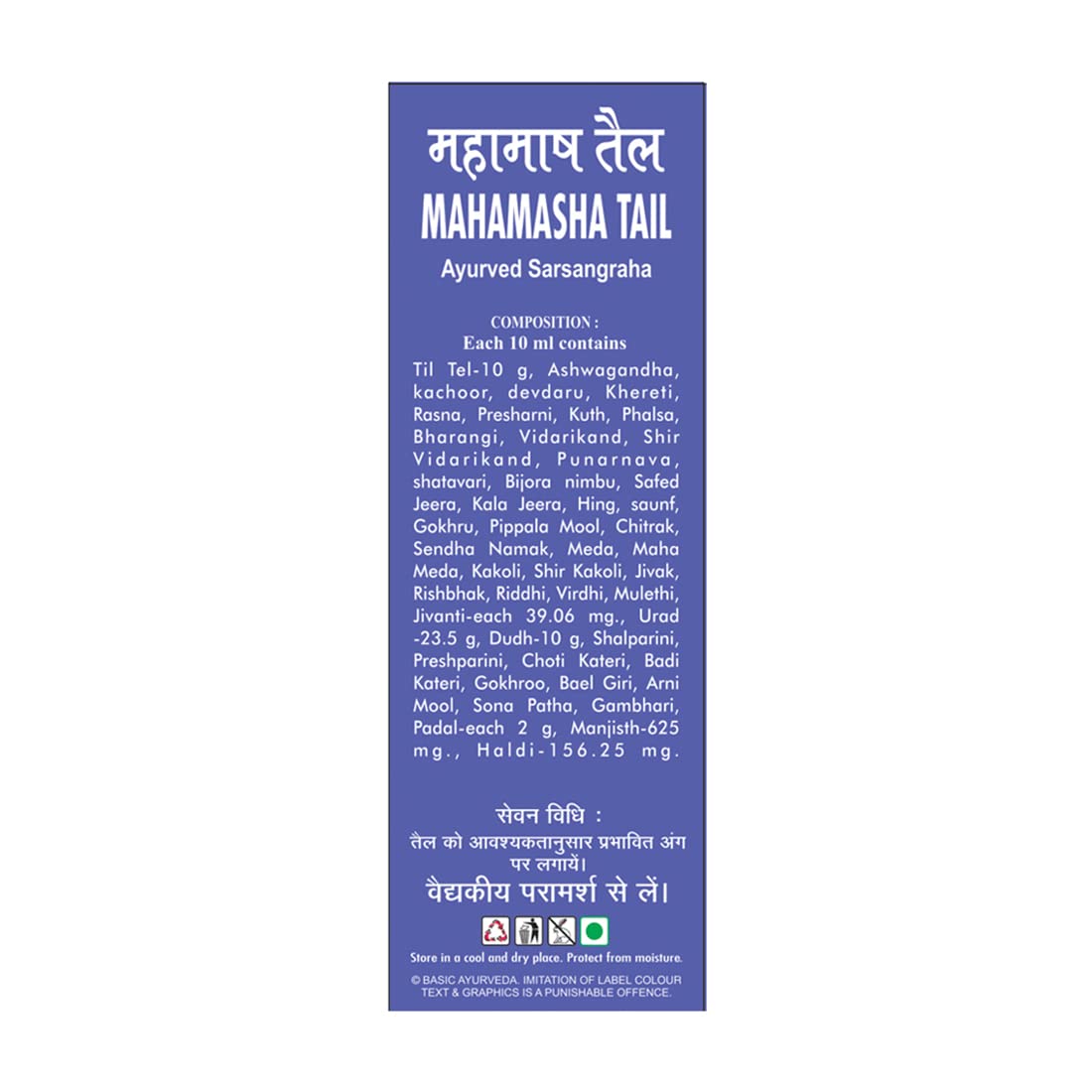• Mahamasha oil has many traditional ayurvedic herbs such as ashwagandha kachoor devdaru khereti rasna presharni kuth phalsa bharangi vidarikand shir vidarikand punarnava shatavari bijora nimbu safed jeera kala jeera hing saunf gokhru pippala mool chitrak s
