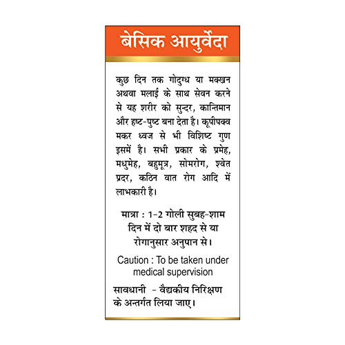• Direction for use: It is recommended to take 1-2 tablet morning and evening twice in day or according to problems or as directed by physician. It is suggested to administer Makar Dhwaj Rasayan with Honey for better absorption and efficiency.
