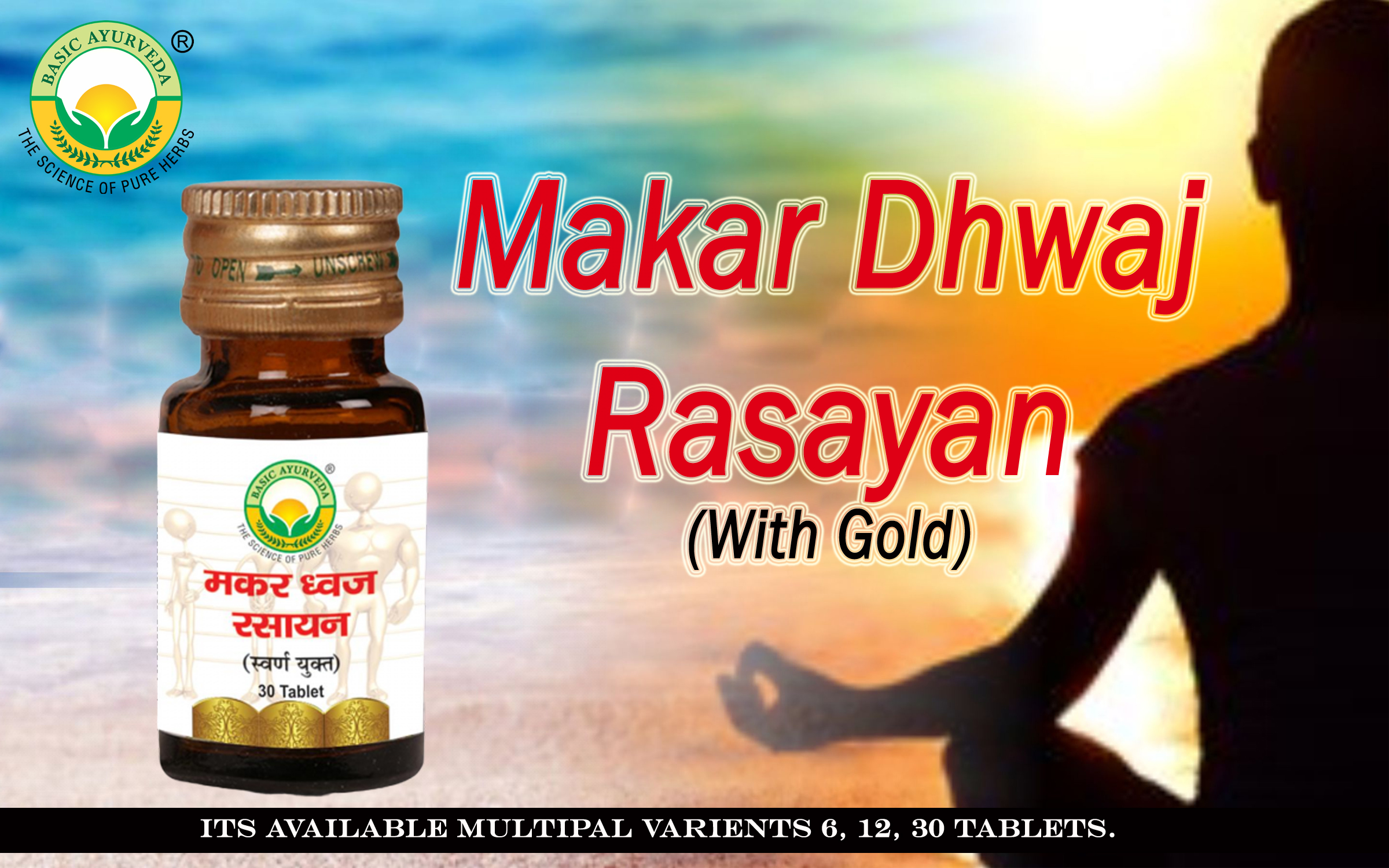 • Makar Dhwaj Rasayan gold tablet is used to improve the strength of the heart muscles. It helps to improve immunity and general weakness. It is effective on tridosha balance vata pitta and kapha.