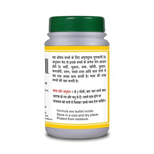 • In case of loose motion this tablet should be given with jaiphal (grind jaiphal on stone with water). It is a strong anti-emetic and analgesic. The tablets improve Vata and Kapha in the body.