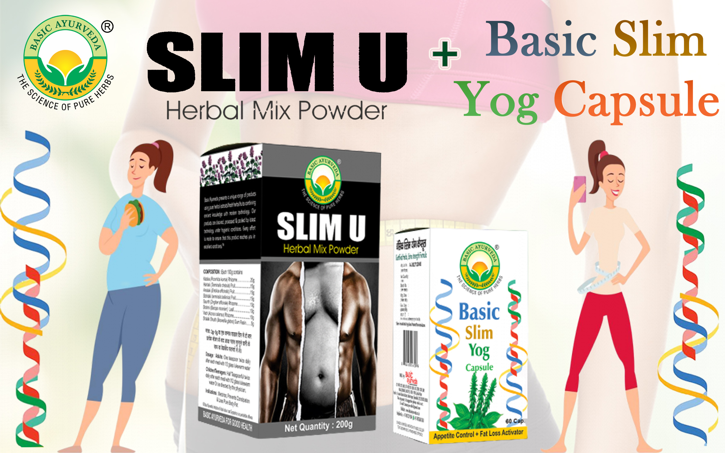 • Slim U Herbal Mix Powder and Basic Slim Yog Capsule both are a combo of Basic Ayurveda that works effectively on weight management. Induces natural destruction and elimination of plump cells and inhibits the accumulation of excess lipids.