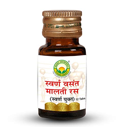 • Swarn Vasant Malti Ras with Gold is an ayurvedic herbal formulation that comes in tablet form. It helps contain numerous common health problems such as temperature cough & cold and general weakness by boosting your immunity.
